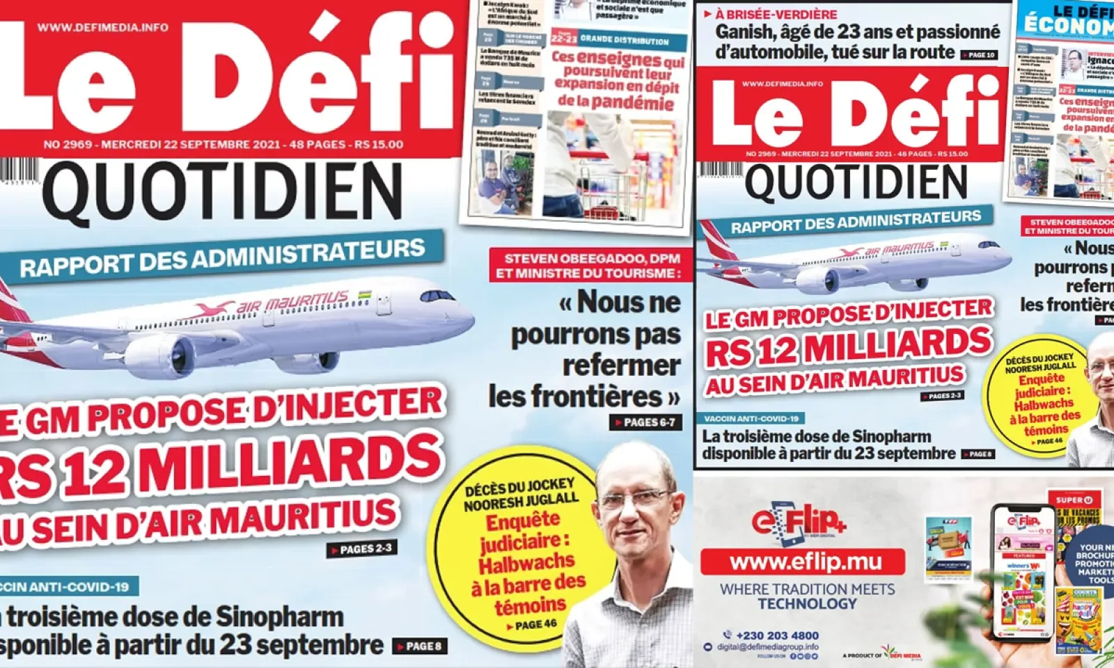 ? Voici la Une du Défi Quotidien. Le journal est en vente à Rs 15 l'exemplaire aux endroits habituels (supermarchés, boutiques, tabagies, superettes). Bonne lecture !