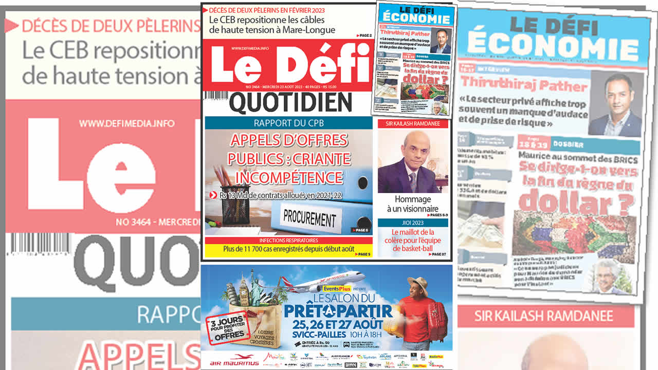 ? Voici la Une du Défi Quotidien. Le journal est en vente à Rs 15 l'exemplaire aux endroits habituels (supermarchés, boutiques, tabagies, superettes). Bonne lecture !