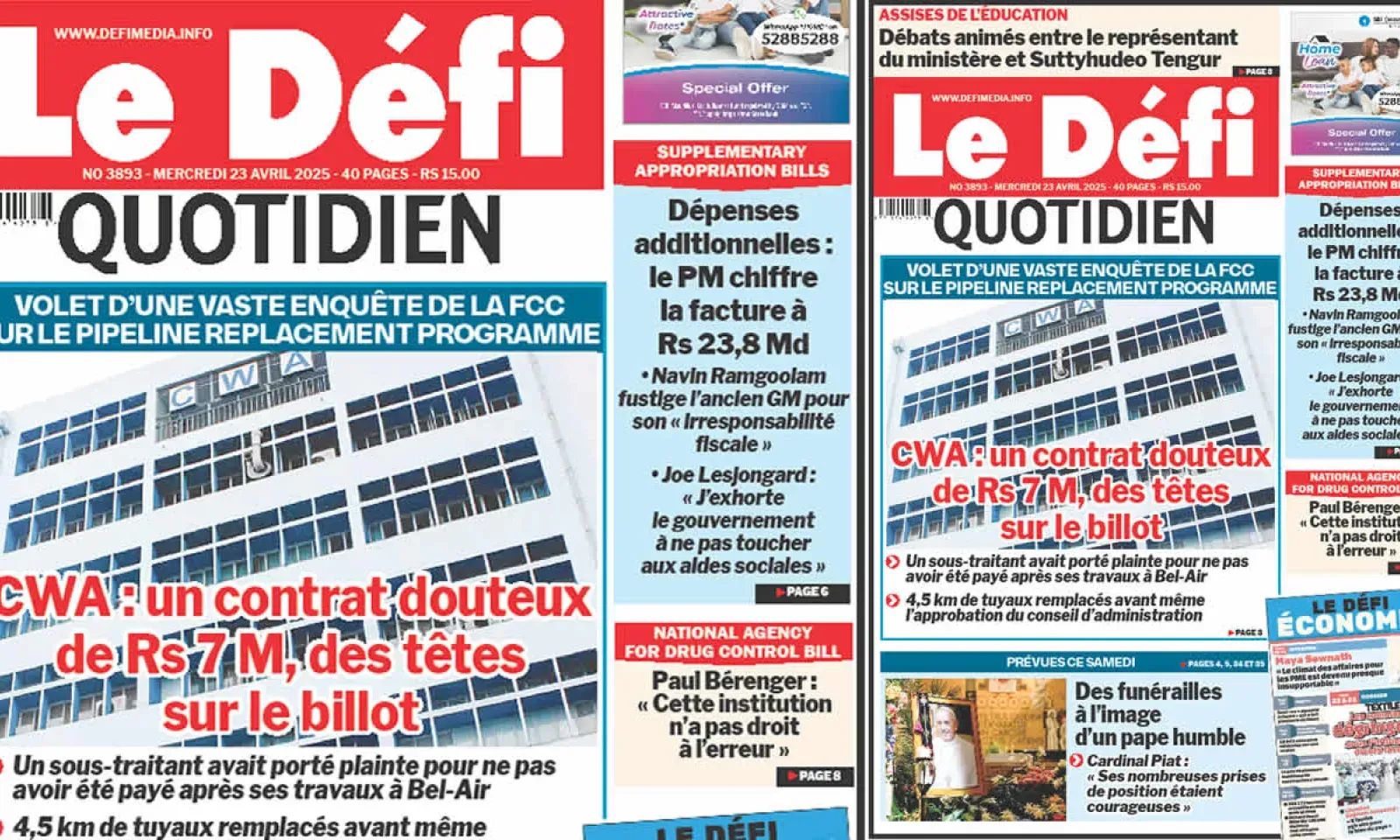 ? Voici la Une du Défi Quotidien. Le journal est en vente à Rs 15 l'exemplaire aux endroits habituels (supermarchés, boutiques, tabagies, superettes). Bonne lecture !