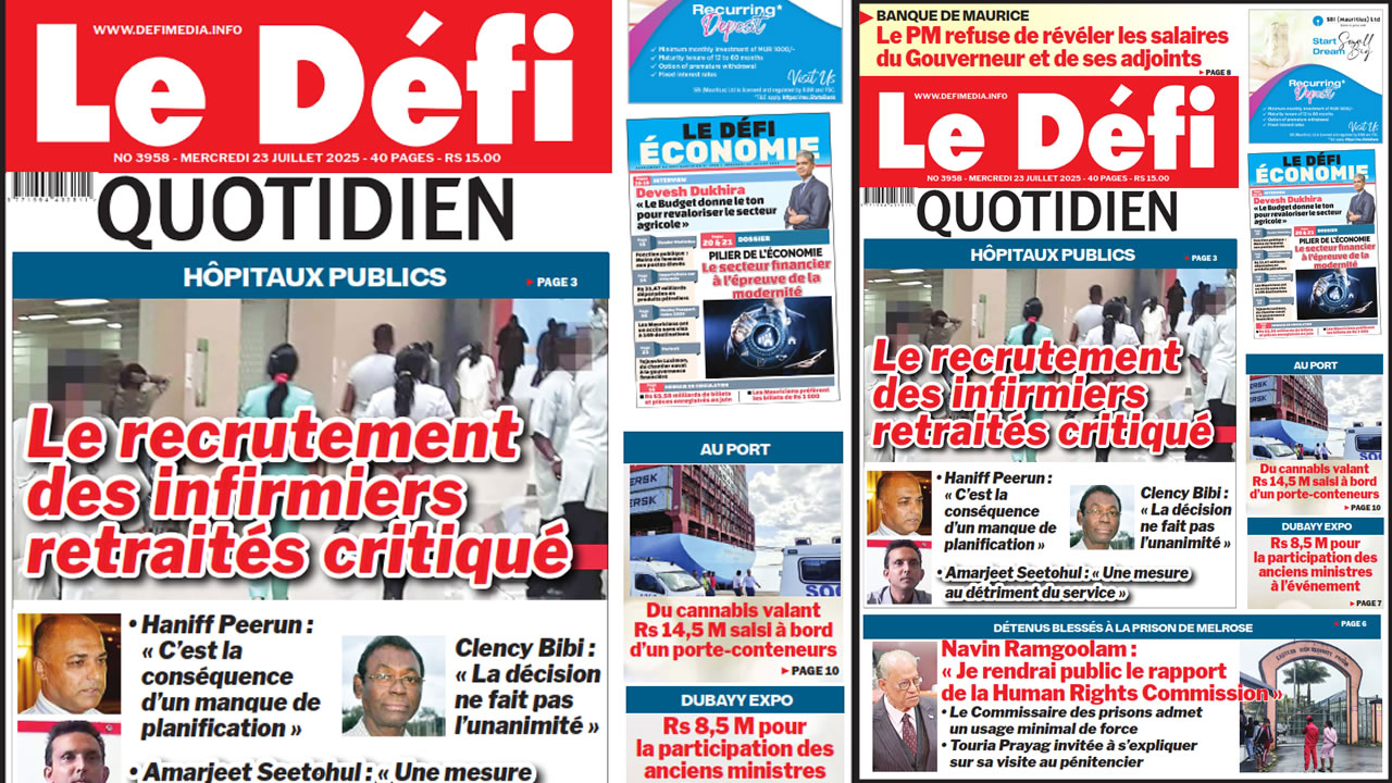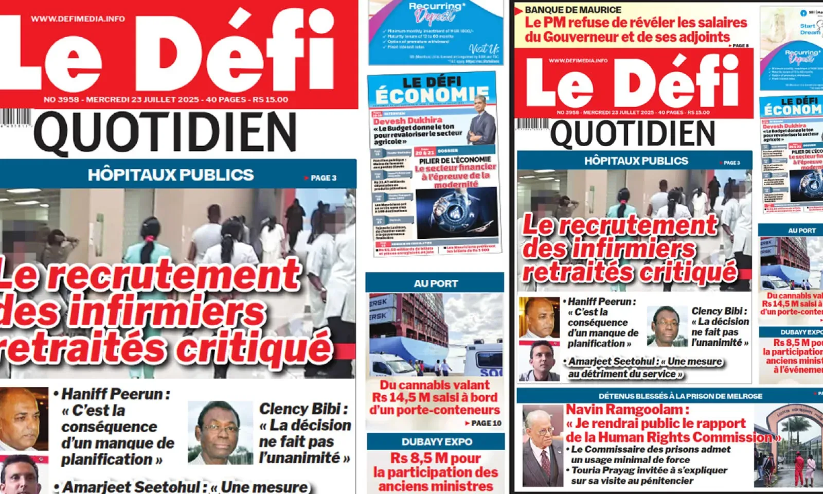 ? Voici la Une du Défi Quotidien. Le journal est en vente à Rs 15 l'exemplaire aux endroits habituels (supermarchés, boutiques, tabagies, superettes). Bonne lecture !