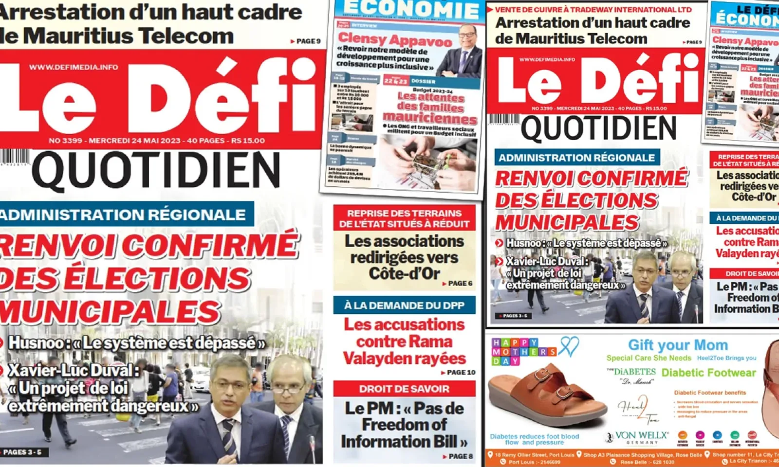 ? Voici la Une du Défi Quotidien. Le journal est en vente à Rs 15 l'exemplaire aux endroits habituels (supermarchés, boutiques, tabagies, superettes). Bonne lecture !