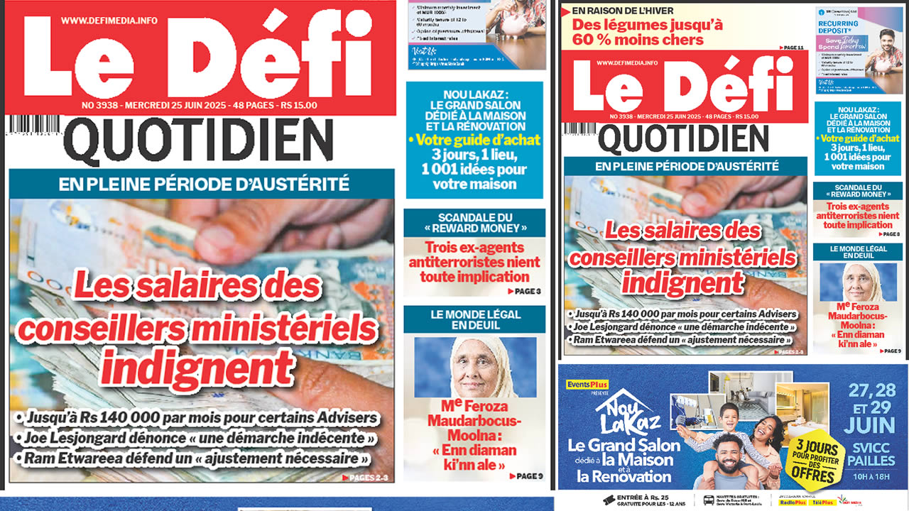 ? Voici la Une du Défi Quotidien. Le journal est en vente à Rs 15 l'exemplaire aux endroits habituels (supermarchés, boutiques, tabagies, superettes). Bonne lecture !