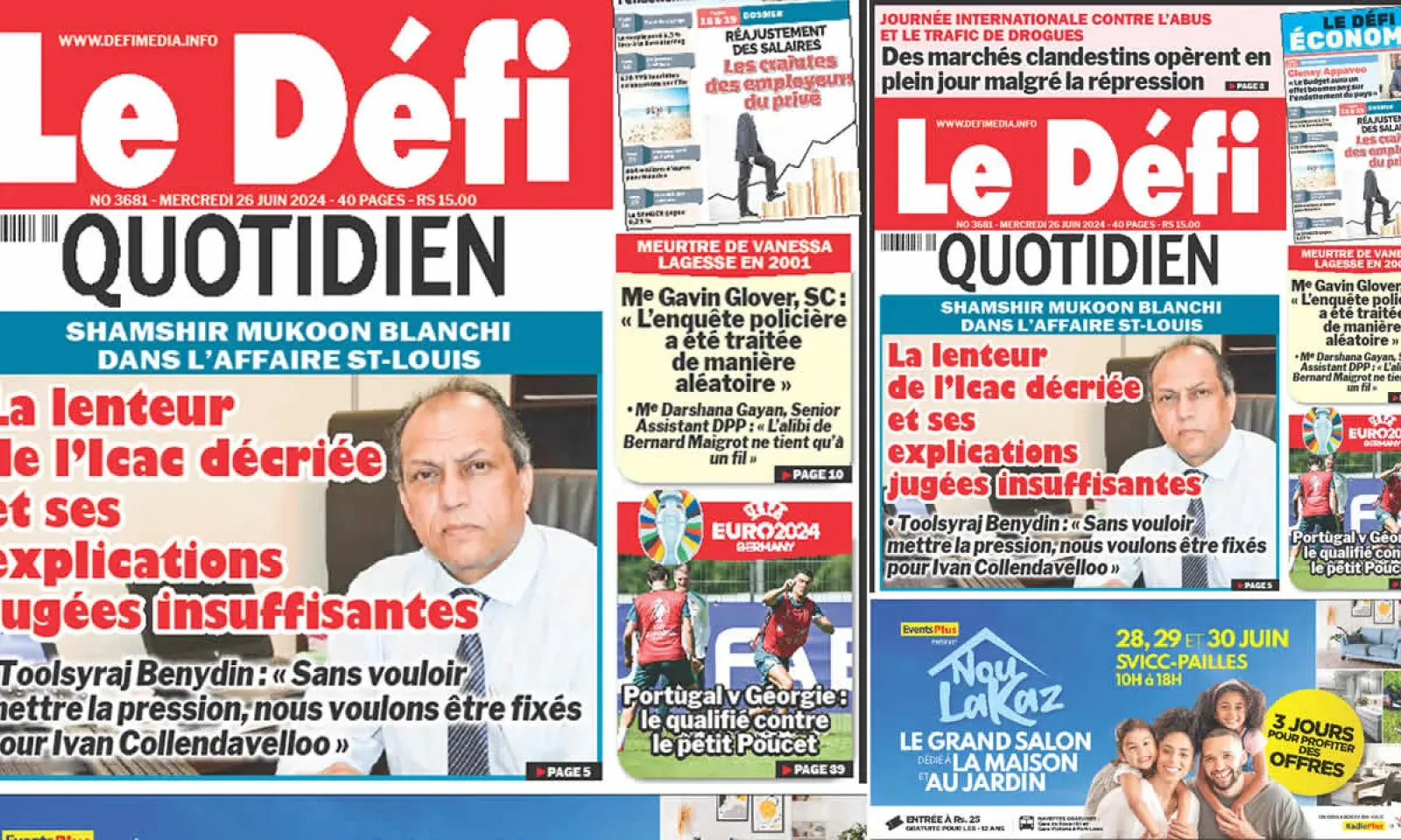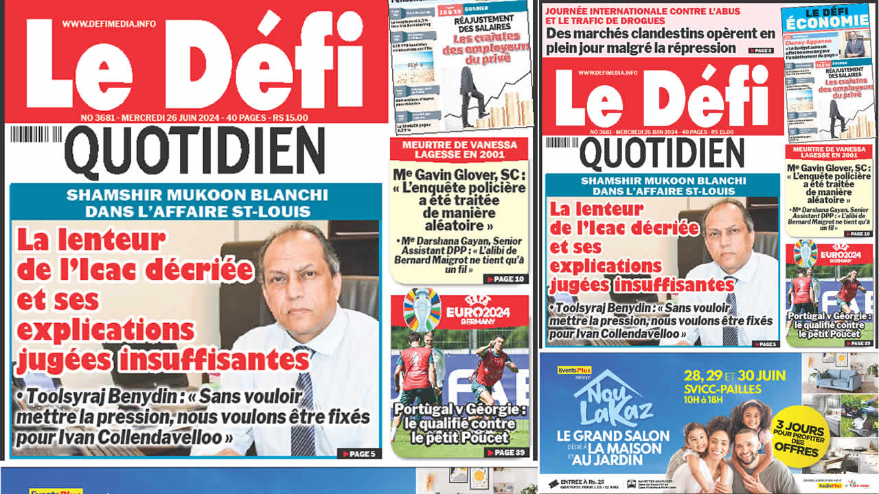 ? Voici la Une du Défi Quotidien. Le journal est en vente à Rs 15 l'exemplaire aux endroits habituels (supermarchés, boutiques, tabagies, superettes). Bonne lecture !