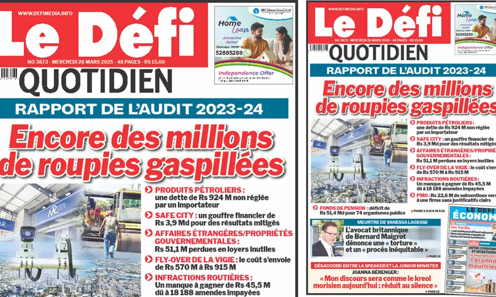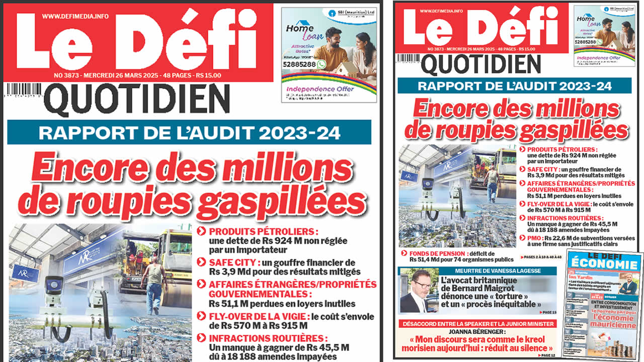 ? Voici la Une du Défi Quotidien. Le journal est en vente à Rs 15 l'exemplaire aux endroits habituels (supermarchés, boutiques, tabagies, superettes). Bonne lecture !