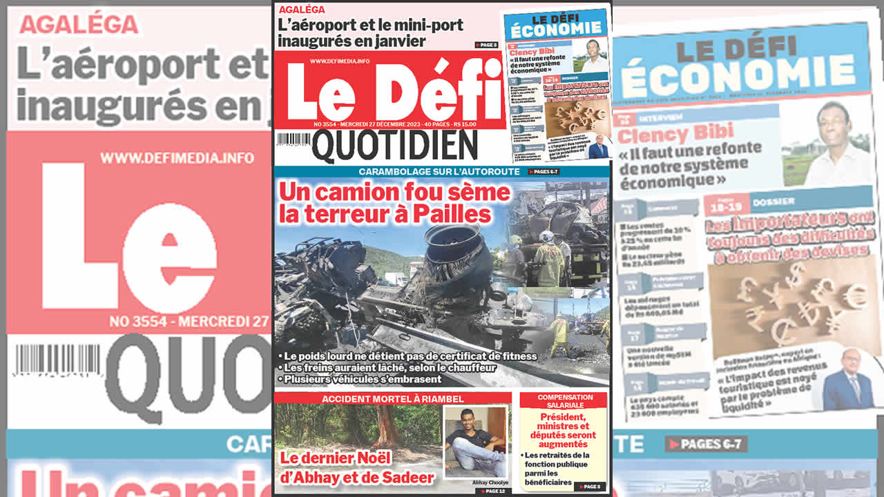 ? Voici la Une du Défi Quotidien. Le journal est en vente à Rs 15 l'exemplaire aux endroits habituels (supermarchés, boutiques, tabagies, superettes). Bonne lecture !