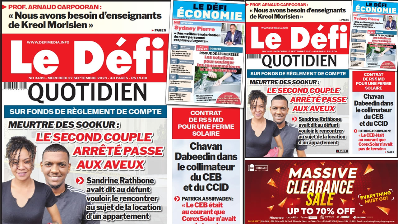 ? Voici la Une du Défi Quotidien. Le journal est en vente à Rs 15 l'exemplaire aux endroits habituels (supermarchés, boutiques, tabagies, superettes). Bonne lecture !