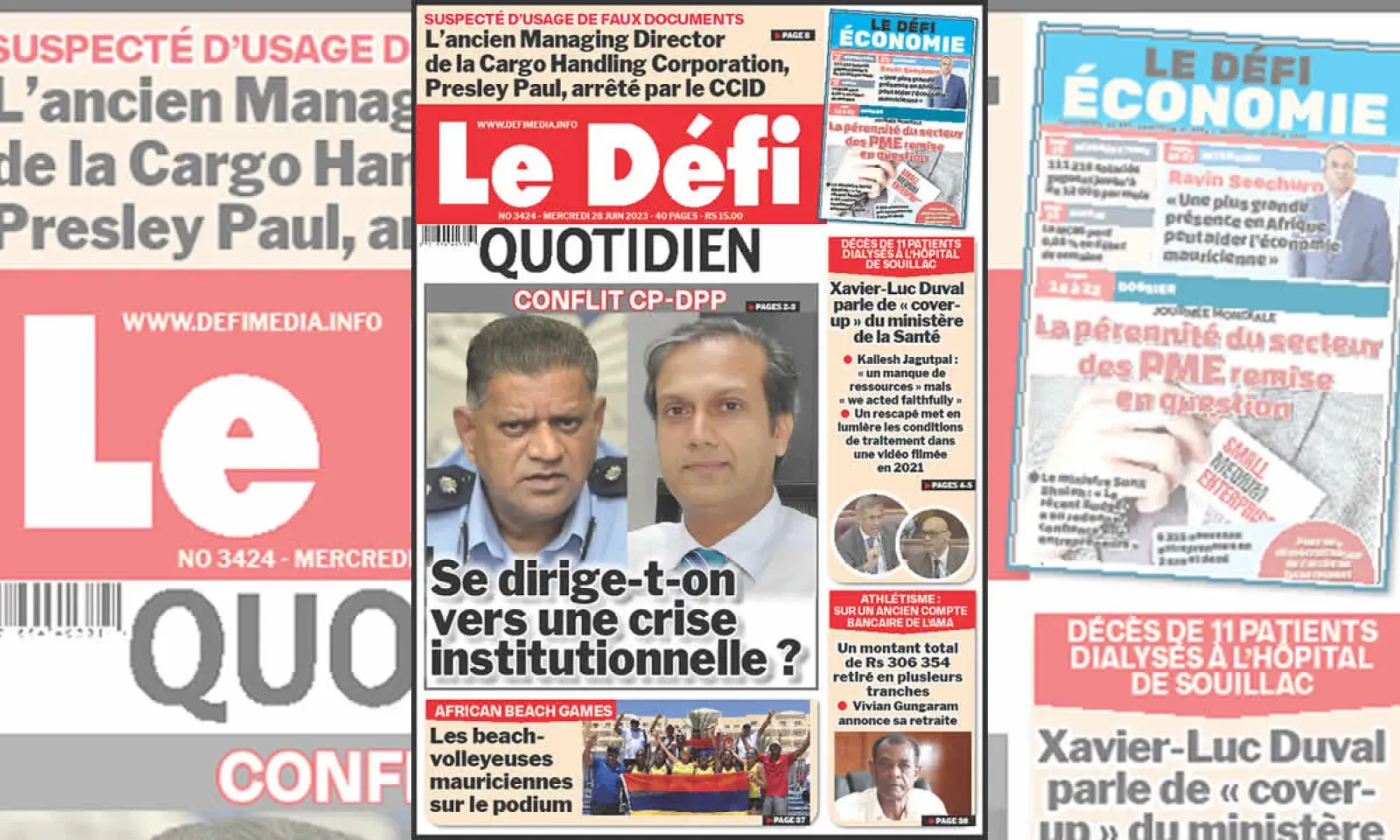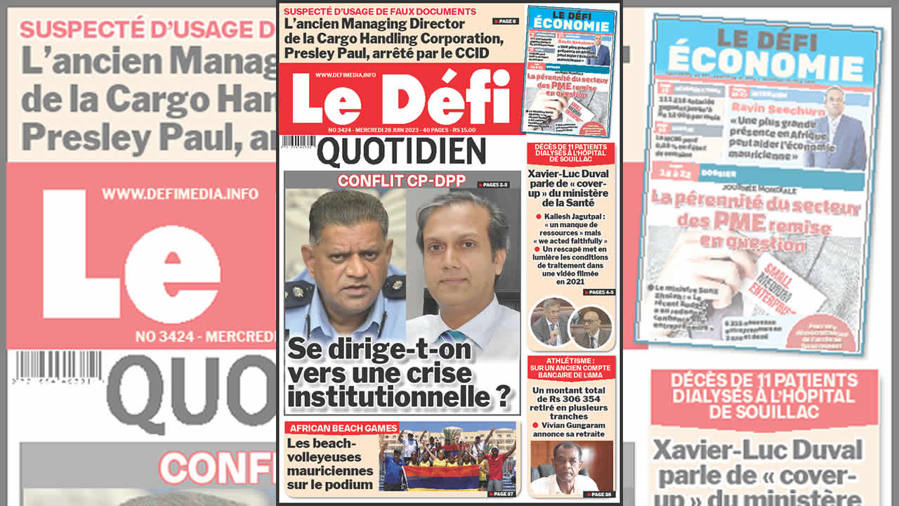 ? Voici la Une du Défi Quotidien. Le journal est en vente à Rs 15 l'exemplaire aux endroits habituels (supermarchés, boutiques, tabagies, superettes). Bonne lecture !
