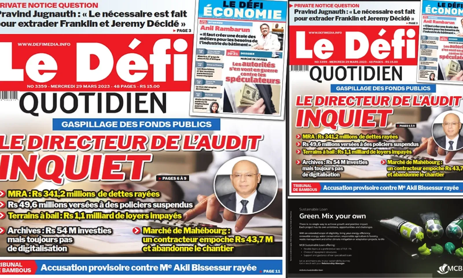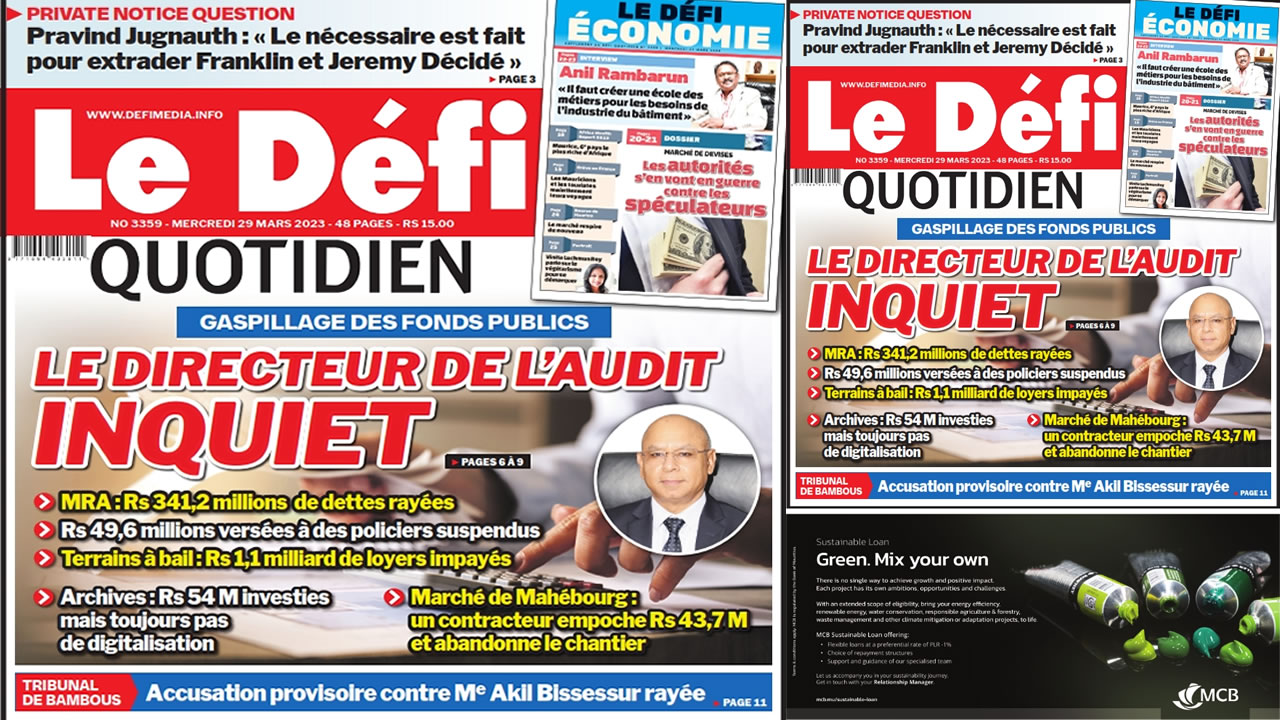 ? Voici la Une du Défi Quotidien. Le journal est en vente à Rs 15 l'exemplaire aux endroits habituels (supermarchés, boutiques, tabagies, superettes). Bonne lecture !