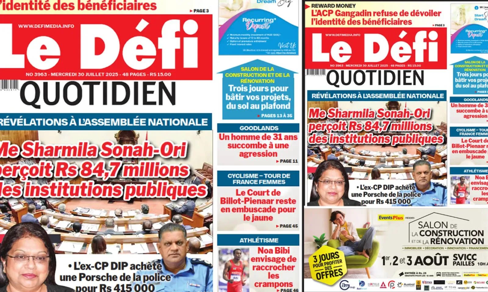 ? Voici la Une du Défi Quotidien. Le journal est en vente à Rs 15 l'exemplaire aux endroits habituels (supermarchés, boutiques, tabagies, superettes). Bonne lecture !