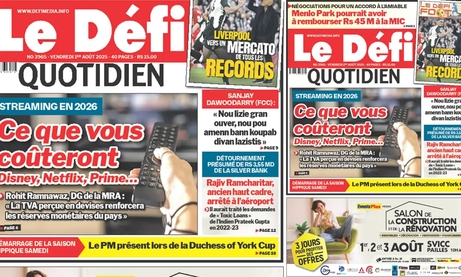 ? Voici la Une du Défi Quotidien. Le journal est en vente à Rs 15 l'exemplaire aux endroits habituels (supermarchés, boutiques, tabagies, superettes). Bonne lecture !