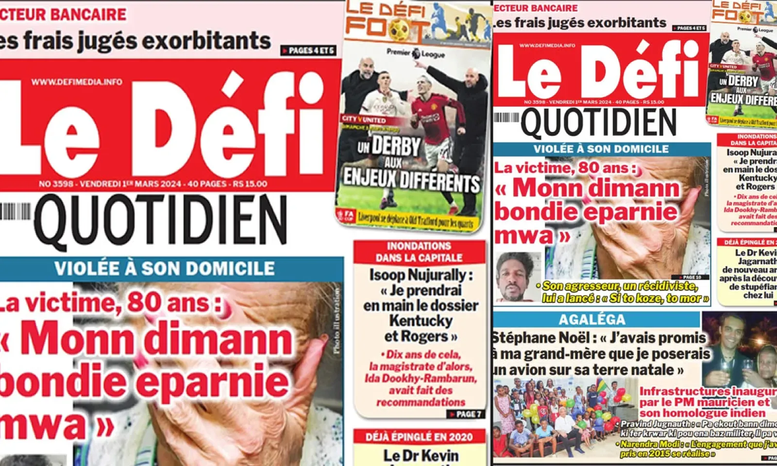 ? Voici la Une du Défi Quotidien. Le journal est en vente à Rs 15 l'exemplaire aux endroits habituels (supermarchés, boutiques, tabagies, superettes). Bonne lecture !