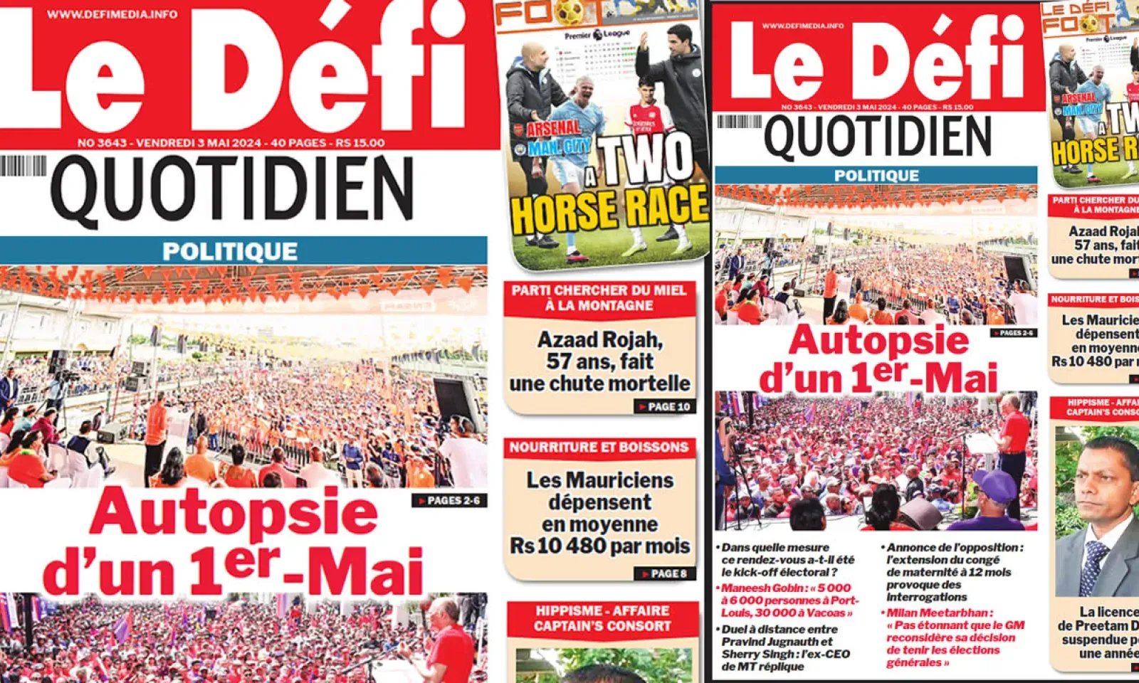 ? Voici la Une du Défi Quotidien. Le journal est en vente à Rs 15 l'exemplaire aux endroits habituels (supermarchés, boutiques, tabagies, superettes). Bonne lecture !