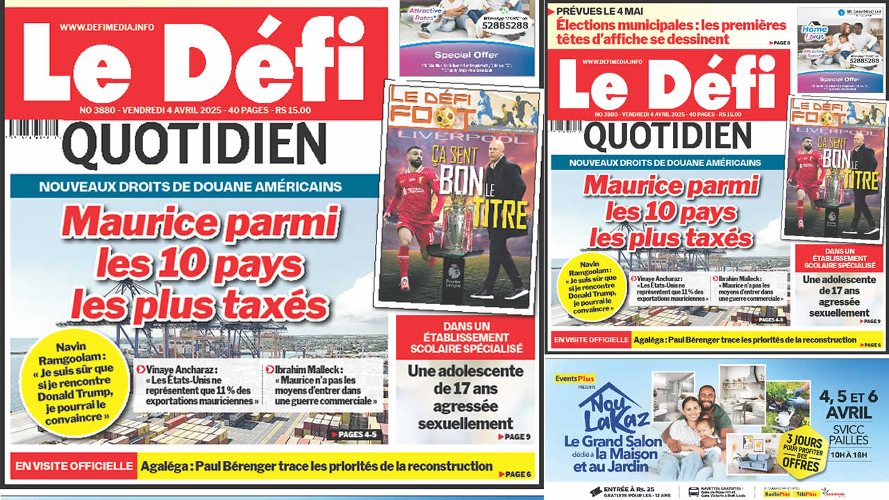 ? Voici la Une du Défi Quotidien. Le journal est en vente à Rs 15 l'exemplaire aux endroits habituels (supermarchés, boutiques, tabagies, superettes). Bonne lecture !