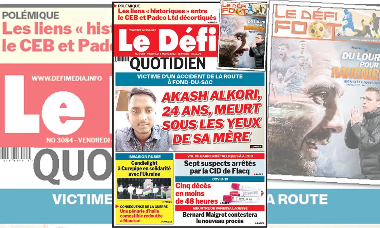 ? Voici la Une du Défi Quotidien. Le journal est en vente à Rs 15 l'exemplaire aux endroits habituels (supermarchés, boutiques, tabagies, superettes). Bonne lecture !