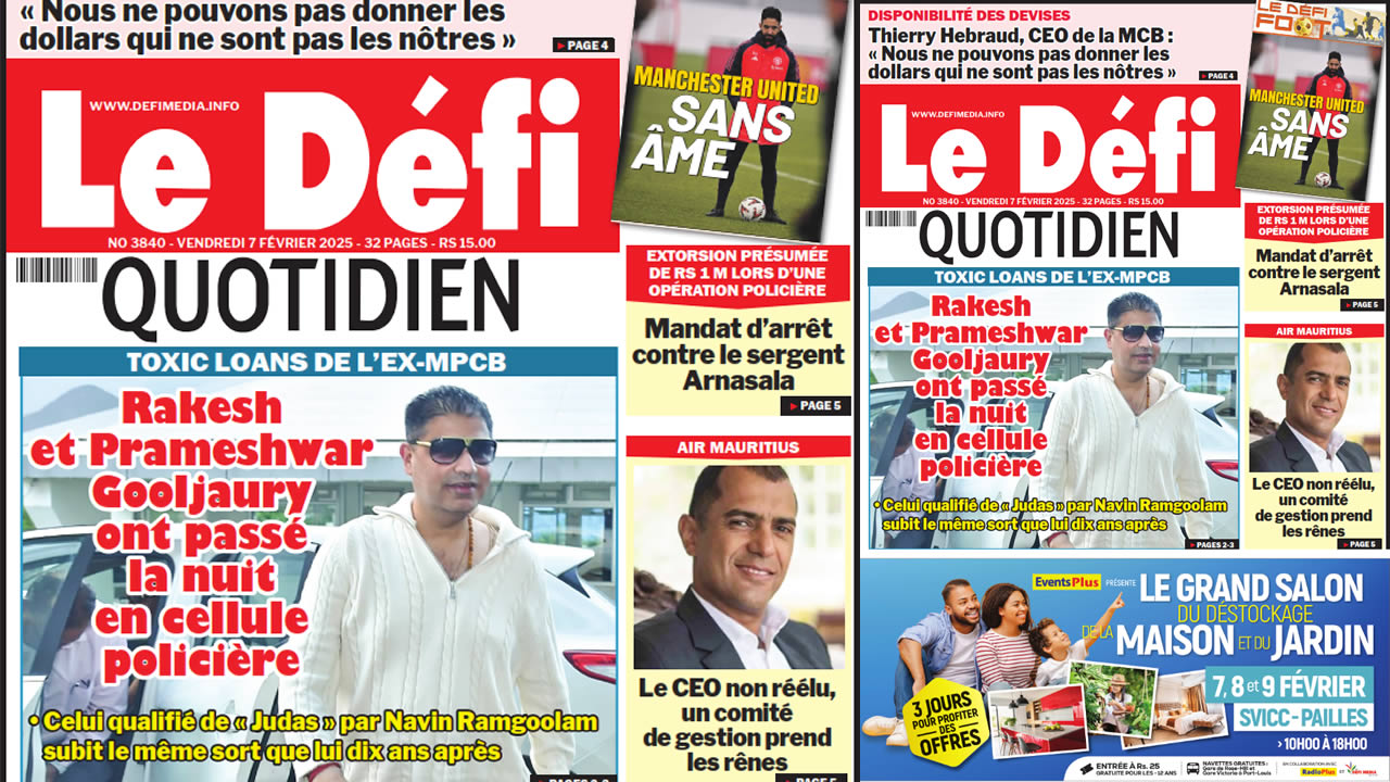 ? Voici la Une du Défi Quotidien. Le journal est en vente à Rs 15 l'exemplaire aux endroits habituels (supermarchés, boutiques, tabagies, superettes). Bonne lecture !