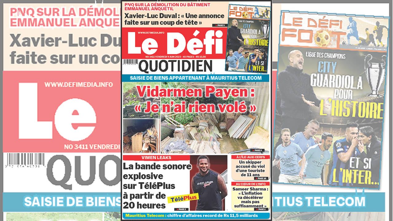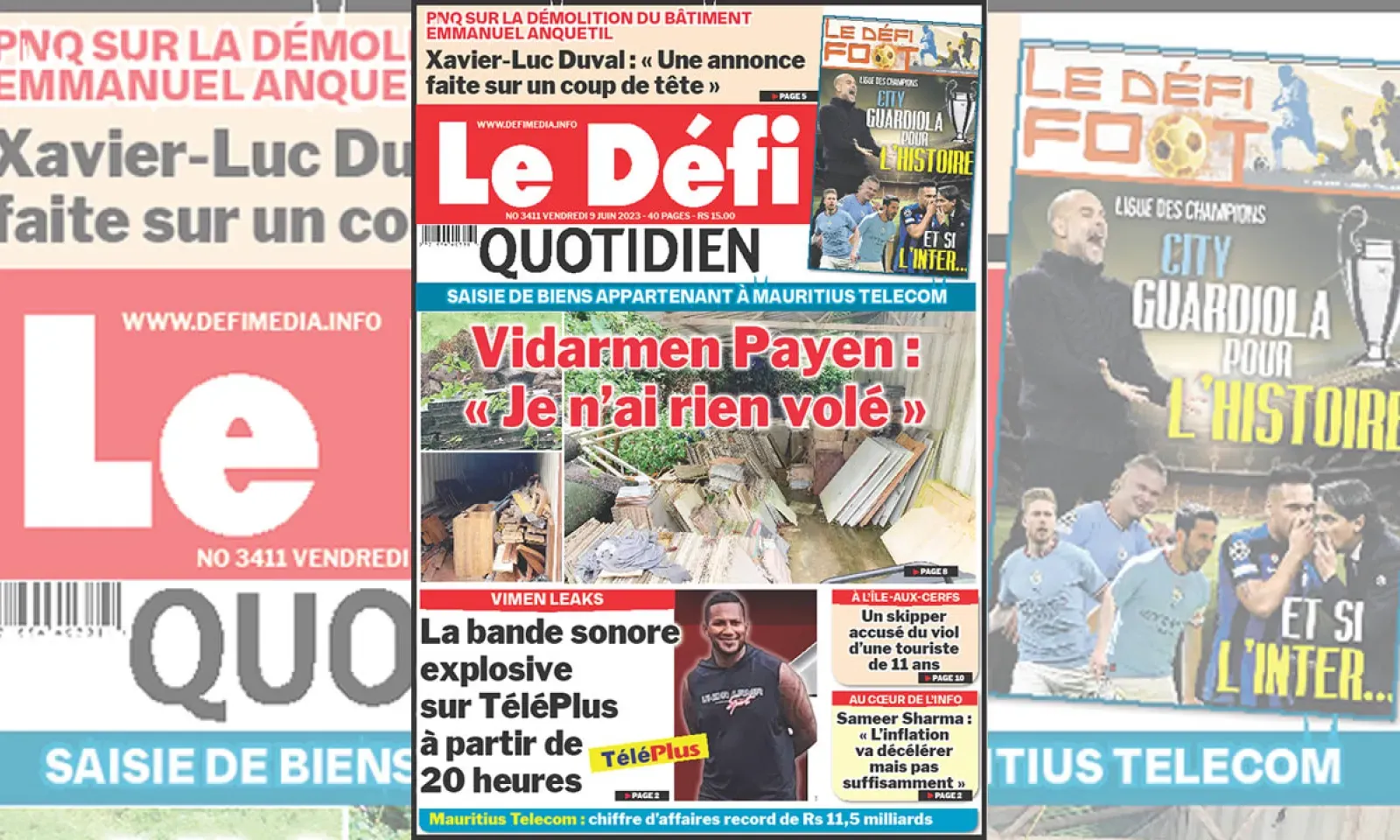 ? Voici la Une du Défi Quotidien. Le journal est en vente à Rs 15 l'exemplaire aux endroits habituels (supermarchés, boutiques, tabagies, superettes). Bonne lecture !