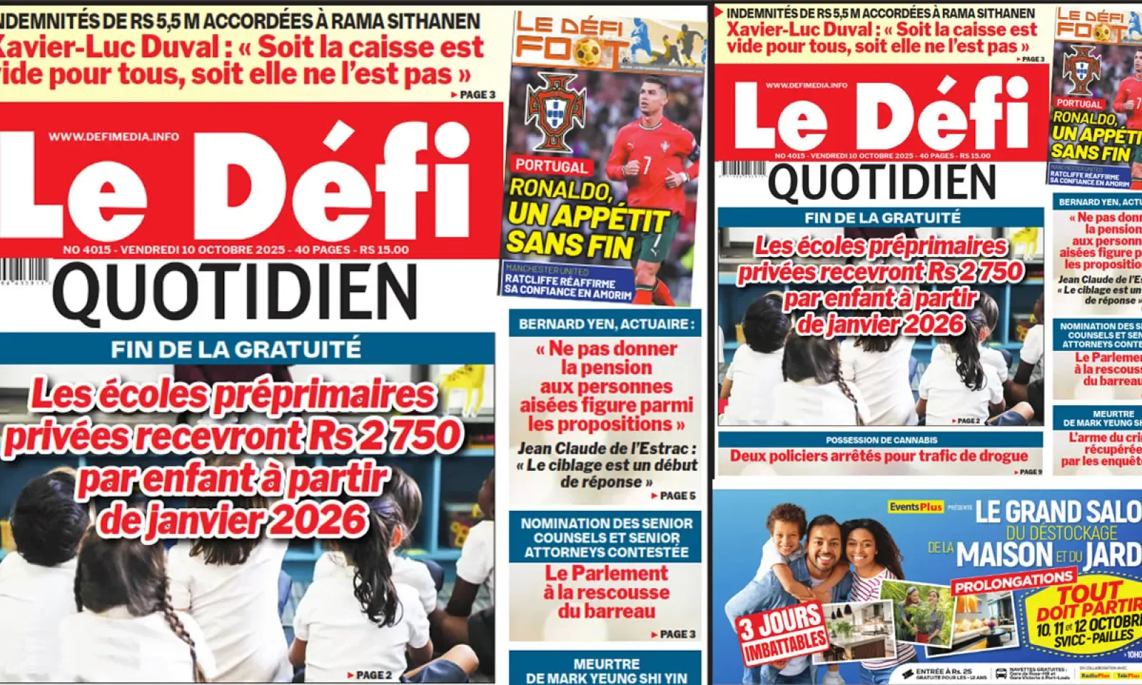 ? Voici la Une du Défi Quotidien. Le journal est en vente à Rs 15 l'exemplaire aux endroits habituels (supermarchés, boutiques, tabagies, superettes). Bonne lecture !