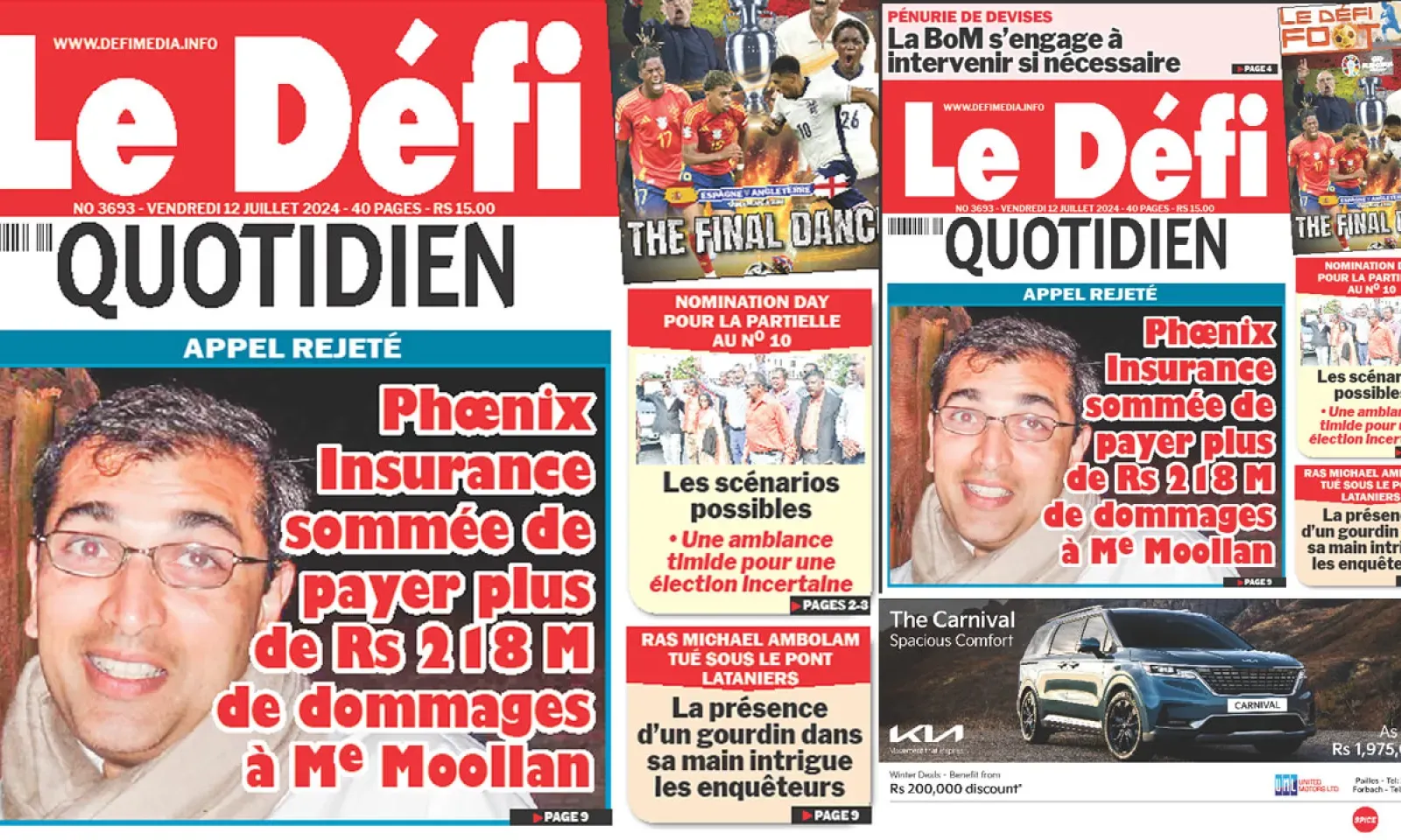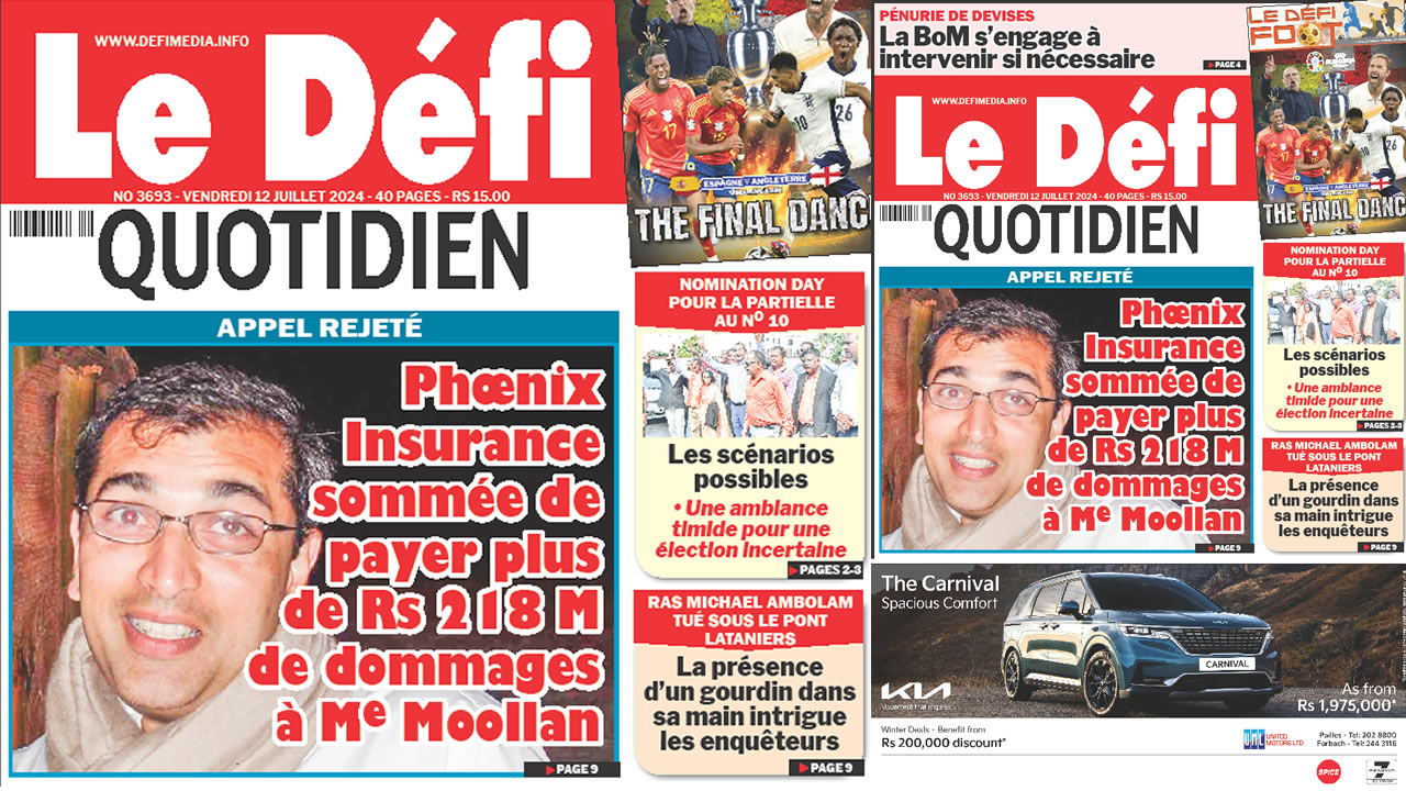 ? Voici la Une du Défi Quotidien. Le journal est en vente à Rs 15 l'exemplaire aux endroits habituels (supermarchés, boutiques, tabagies, superettes). Bonne lecture !