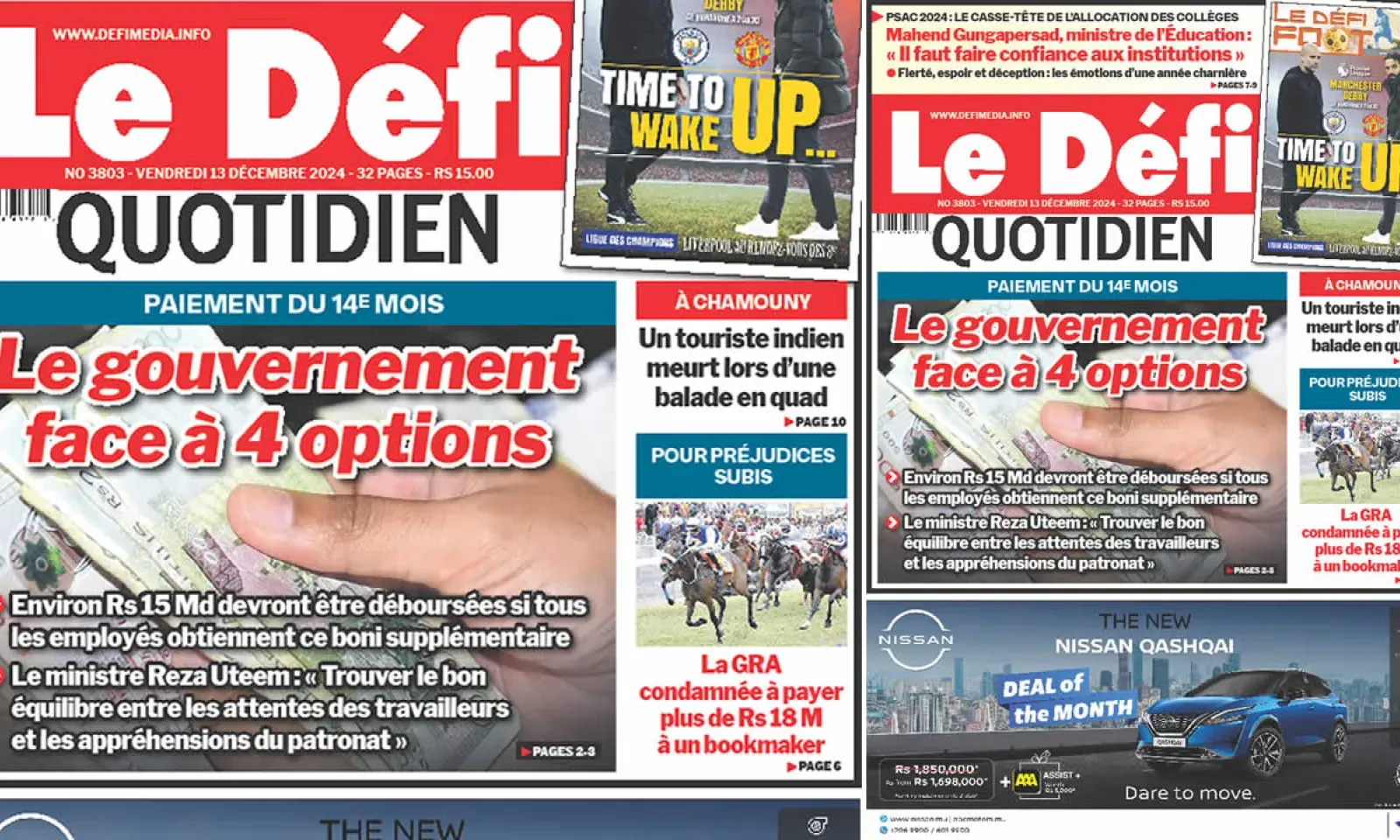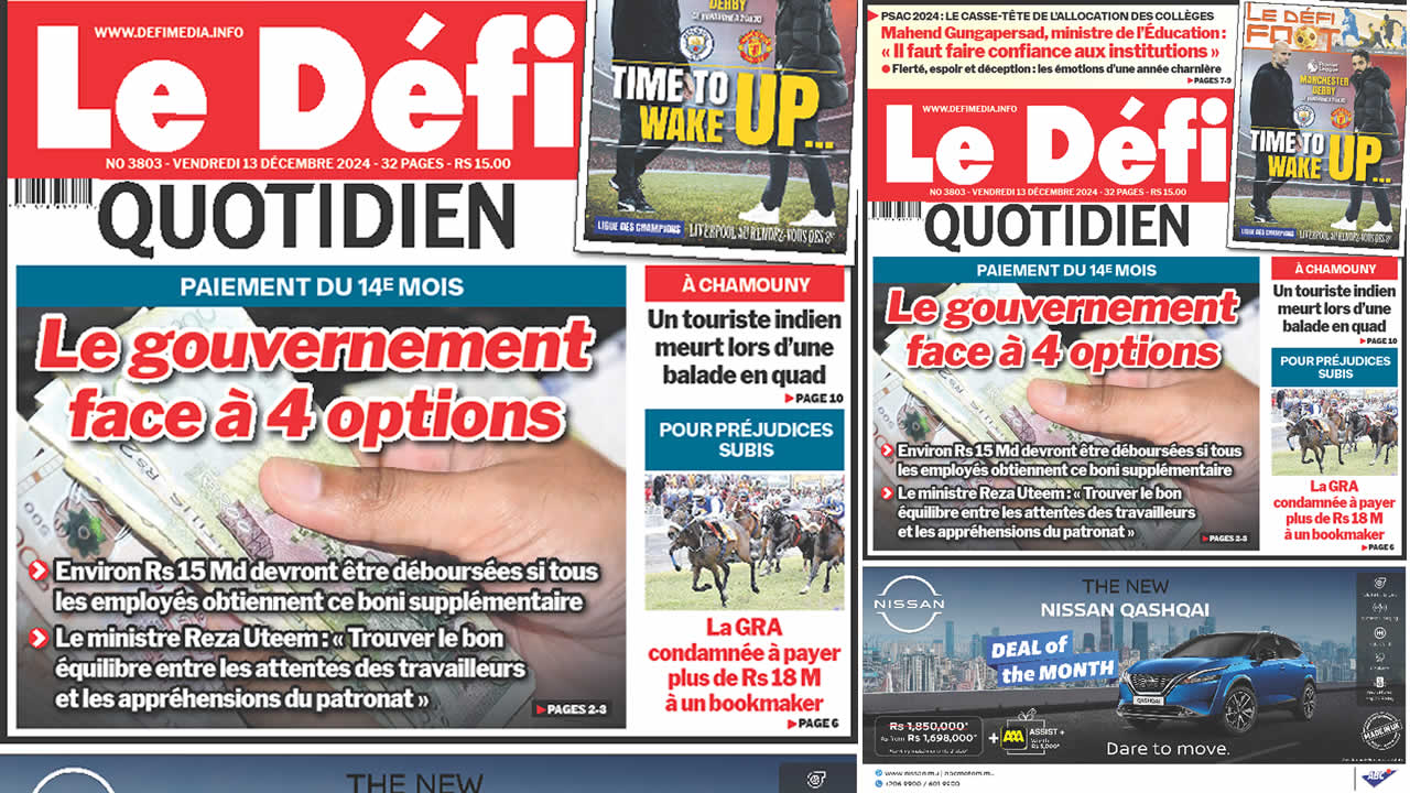 ? Voici la Une du Défi Quotidien. Le journal est en vente à Rs 15 l'exemplaire aux endroits habituels (supermarchés, boutiques, tabagies, superettes). Bonne lecture !