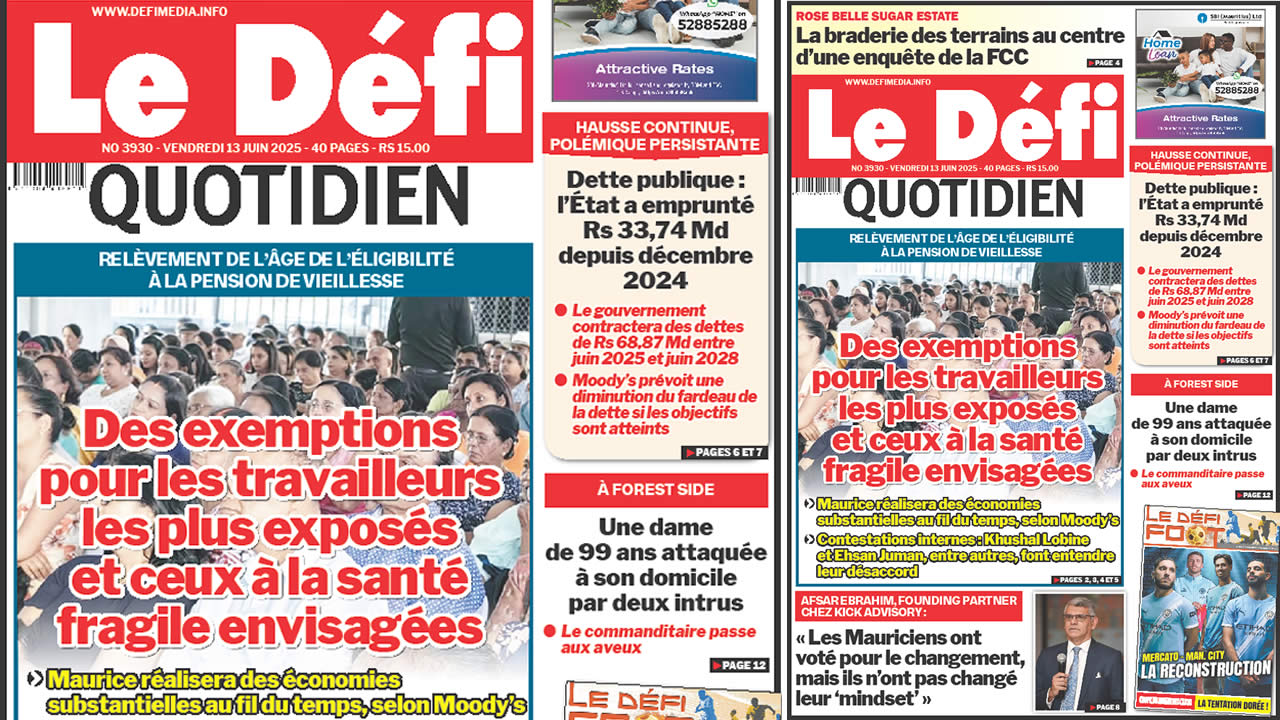 ? Voici la Une du Défi Quotidien. Le journal est en vente à Rs 15 l'exemplaire aux endroits habituels (supermarchés, boutiques, tabagies, superettes). Bonne lecture !