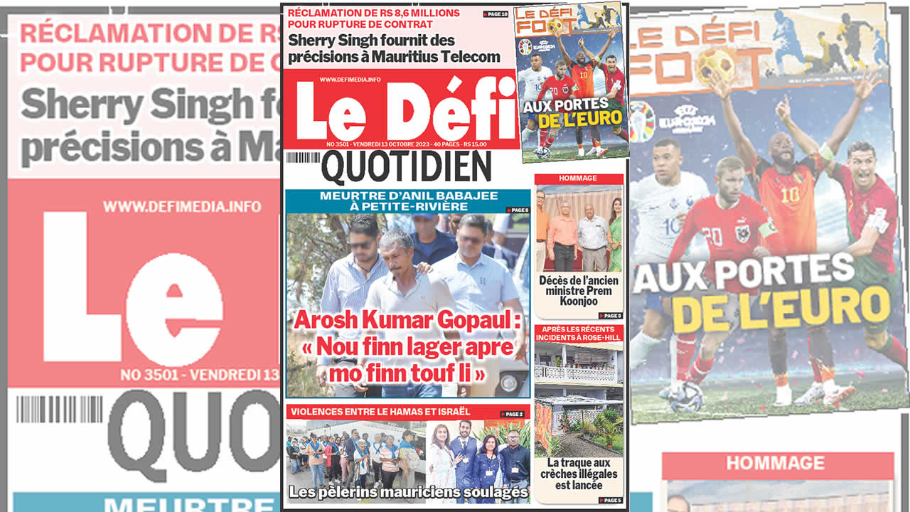 ? Voici la Une du Défi Quotidien. Le journal est en vente à Rs 15 l'exemplaire aux endroits habituels (supermarchés, boutiques, tabagies, superettes). Bonne lecture !
