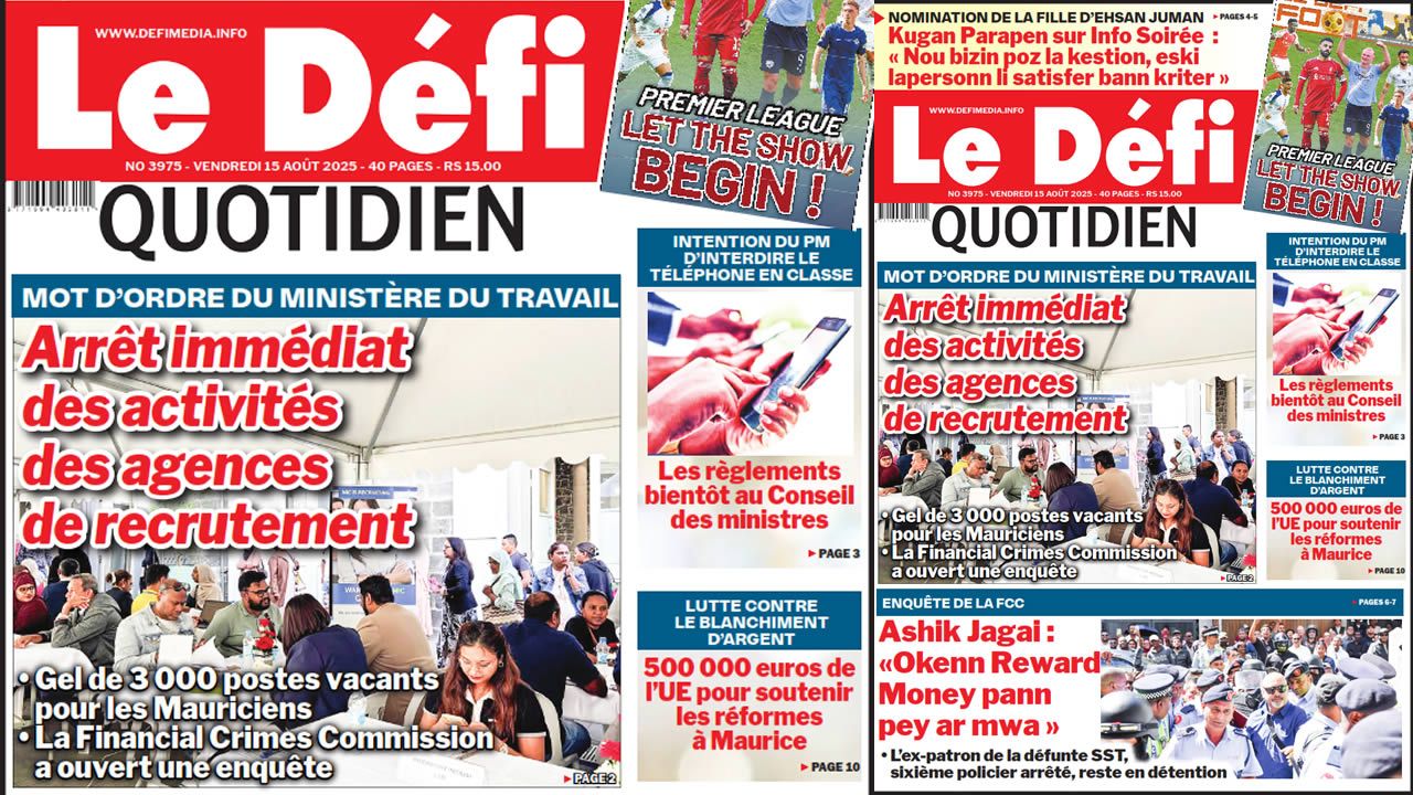 ? Voici la Une du Défi Quotidien. Le journal est en vente à Rs 15 l'exemplaire aux endroits habituels (supermarchés, boutiques, tabagies, superettes). Bonne lecture !