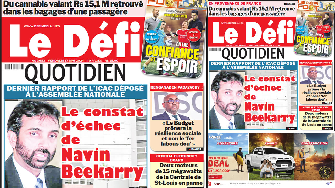 ? Voici la Une du Défi Quotidien. Le journal est en vente à Rs 15 l'exemplaire aux endroits habituels (supermarchés, boutiques, tabagies, superettes). Bonne lecture !