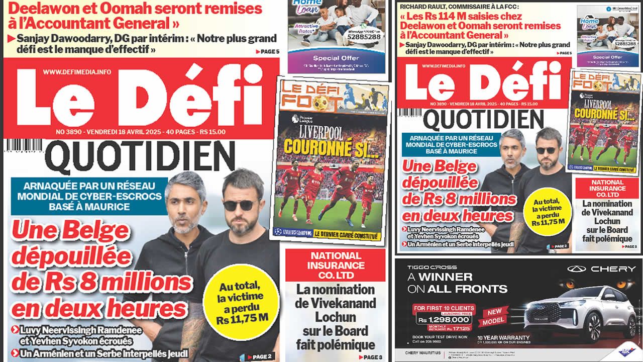 ? Voici la Une du Défi Quotidien. Le journal est en vente à Rs 15 l'exemplaire aux endroits habituels (supermarchés, boutiques, tabagies, superettes). Bonne lecture !
