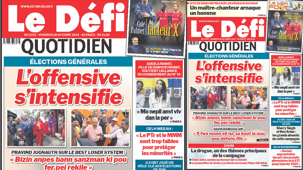 ? Voici la Une du Défi Quotidien. Le journal est en vente à Rs 15 l'exemplaire aux endroits habituels (supermarchés, boutiques, tabagies, superettes). Bonne lecture !