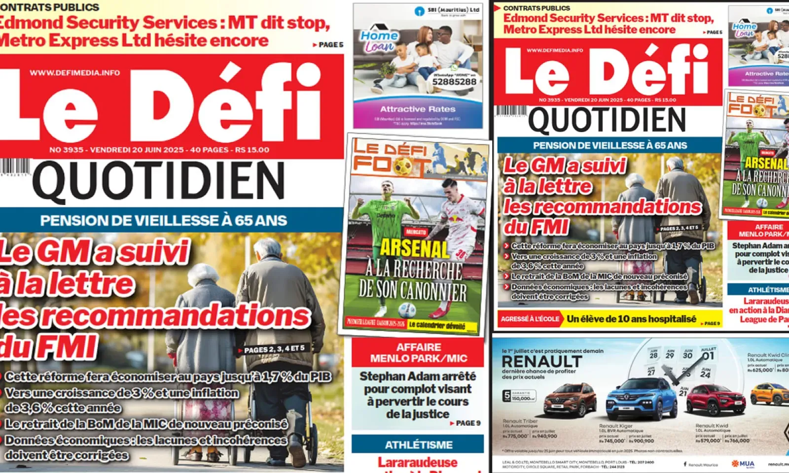 ? Voici la Une du Défi Quotidien. Le journal est en vente à Rs 15 l'exemplaire aux endroits habituels (supermarchés, boutiques, tabagies, superettes). Bonne lecture !
