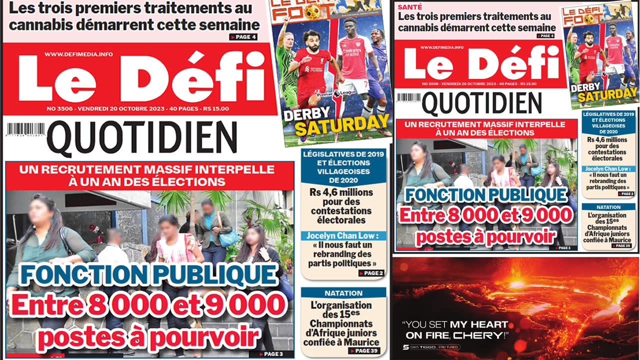 ? Voici la Une du Défi Quotidien. Le journal est en vente à Rs 15 l'exemplaire aux endroits habituels (supermarchés, boutiques, tabagies, superettes). Bonne lecture !