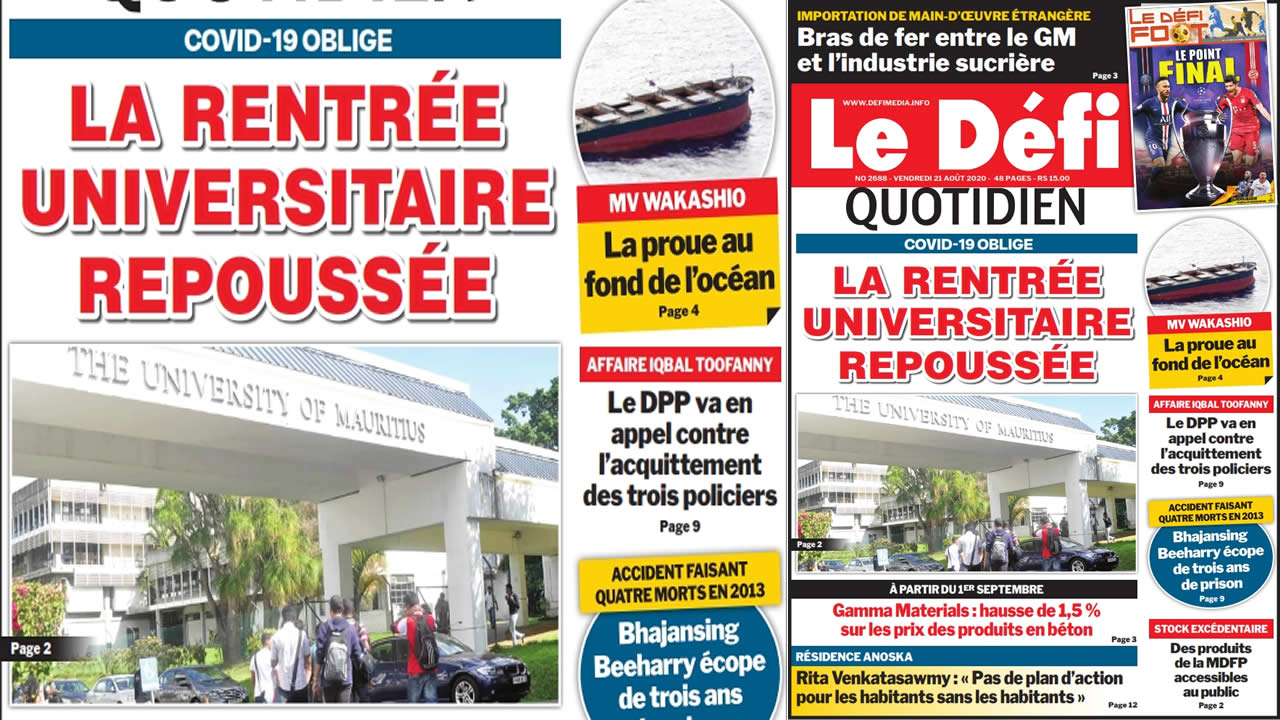 Voici la Une du Defi Quotidien de ce vendredi 21 août 2020
