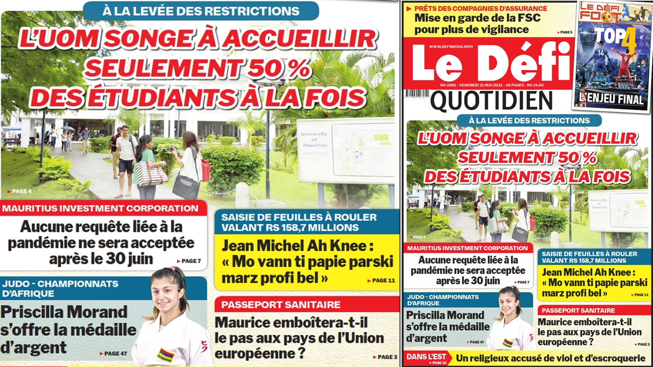 ? Voici la Une du Défi Quotidien. Le journal est en vente à Rs 15 l'exemplaire aux endroits habituels (supermarchés, boutiques, tabagies, superettes). Bonne lecture !