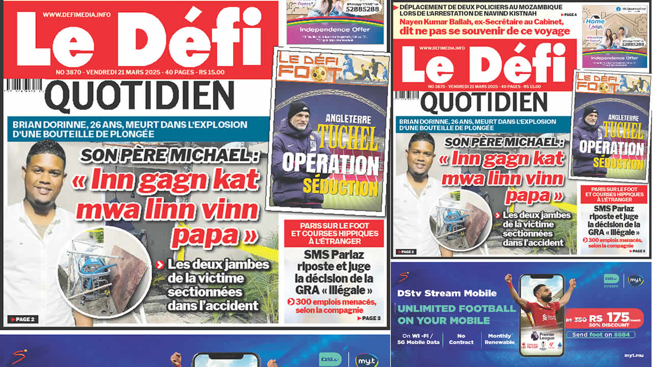 ? Voici la Une du Défi Quotidien. Le journal est en vente à Rs 15 l'exemplaire aux endroits habituels (supermarchés, boutiques, tabagies, superettes). Bonne lecture !