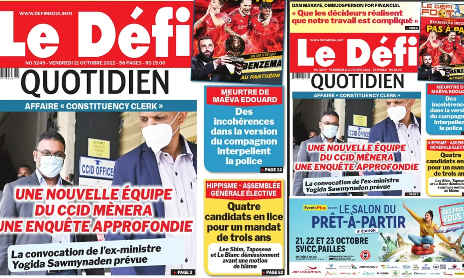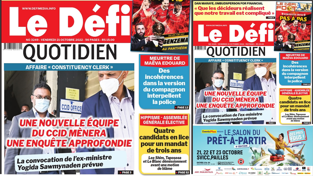 Voici la une du Défi Quotidien de ce vendredi 21 Octobre 2022