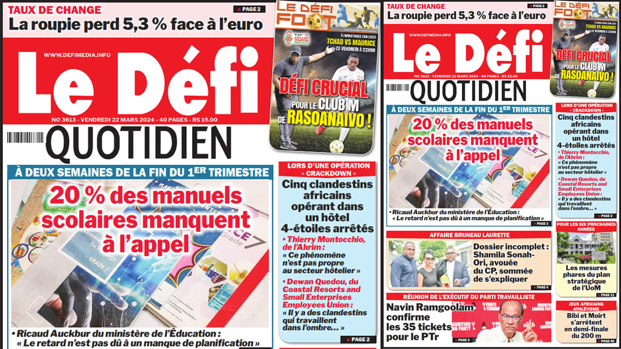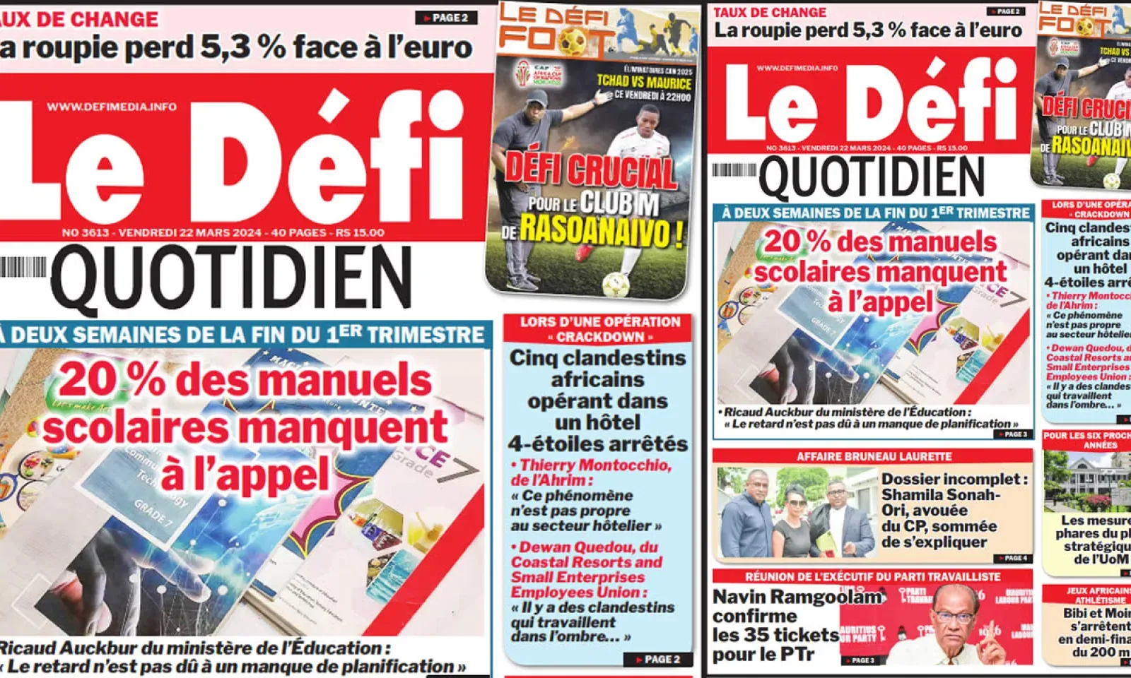 ? Voici la Une du Défi Quotidien. Le journal est en vente à Rs 15 l'exemplaire aux endroits habituels (supermarchés, boutiques, tabagies, superettes). Bonne lecture !