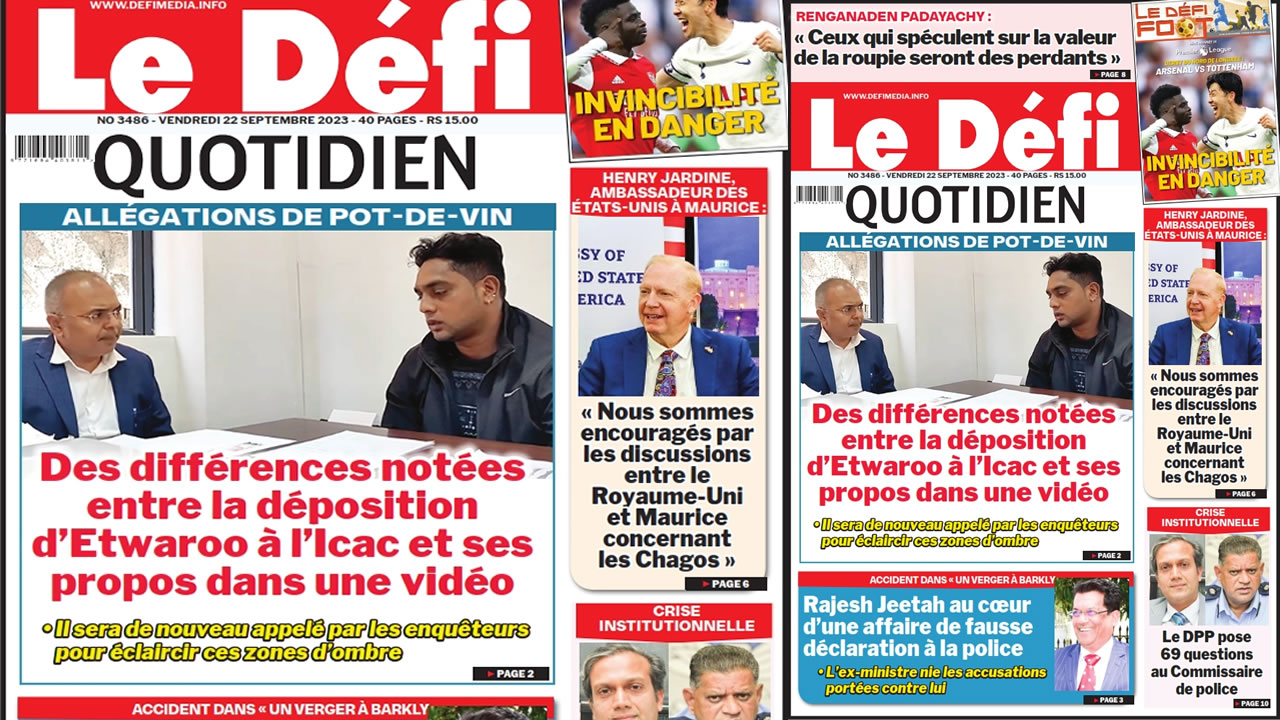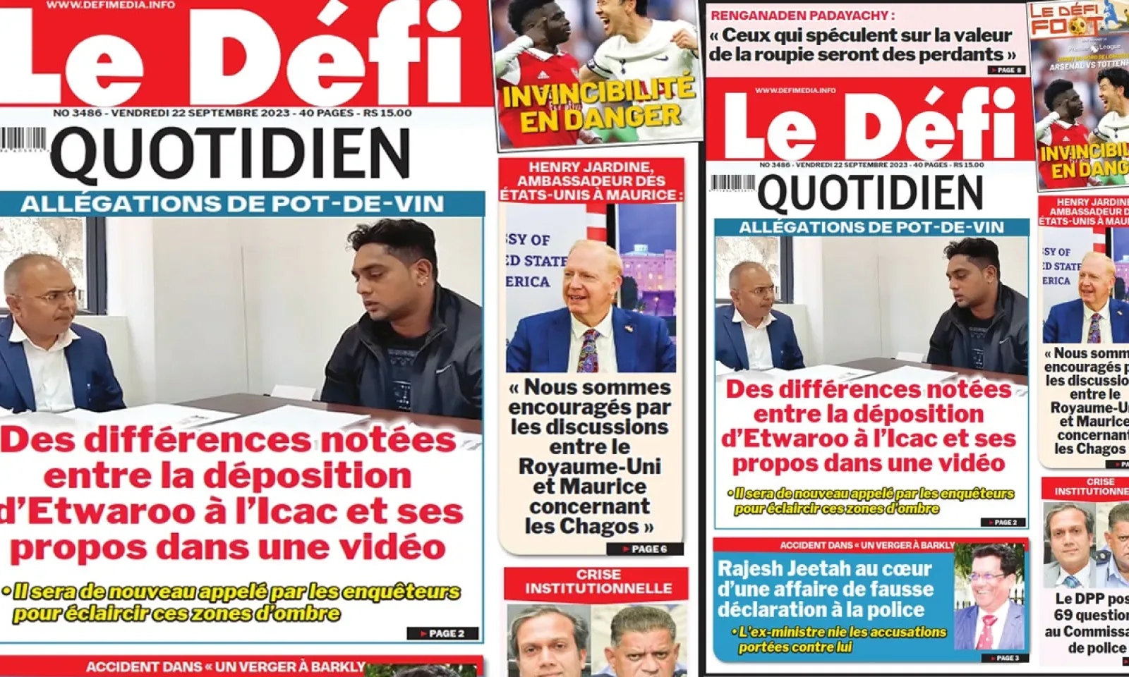 ? Voici la Une du Défi Quotidien. Le journal est en vente à Rs 15 l'exemplaire aux endroits habituels (supermarchés, boutiques, tabagies, superettes). Bonne lecture !