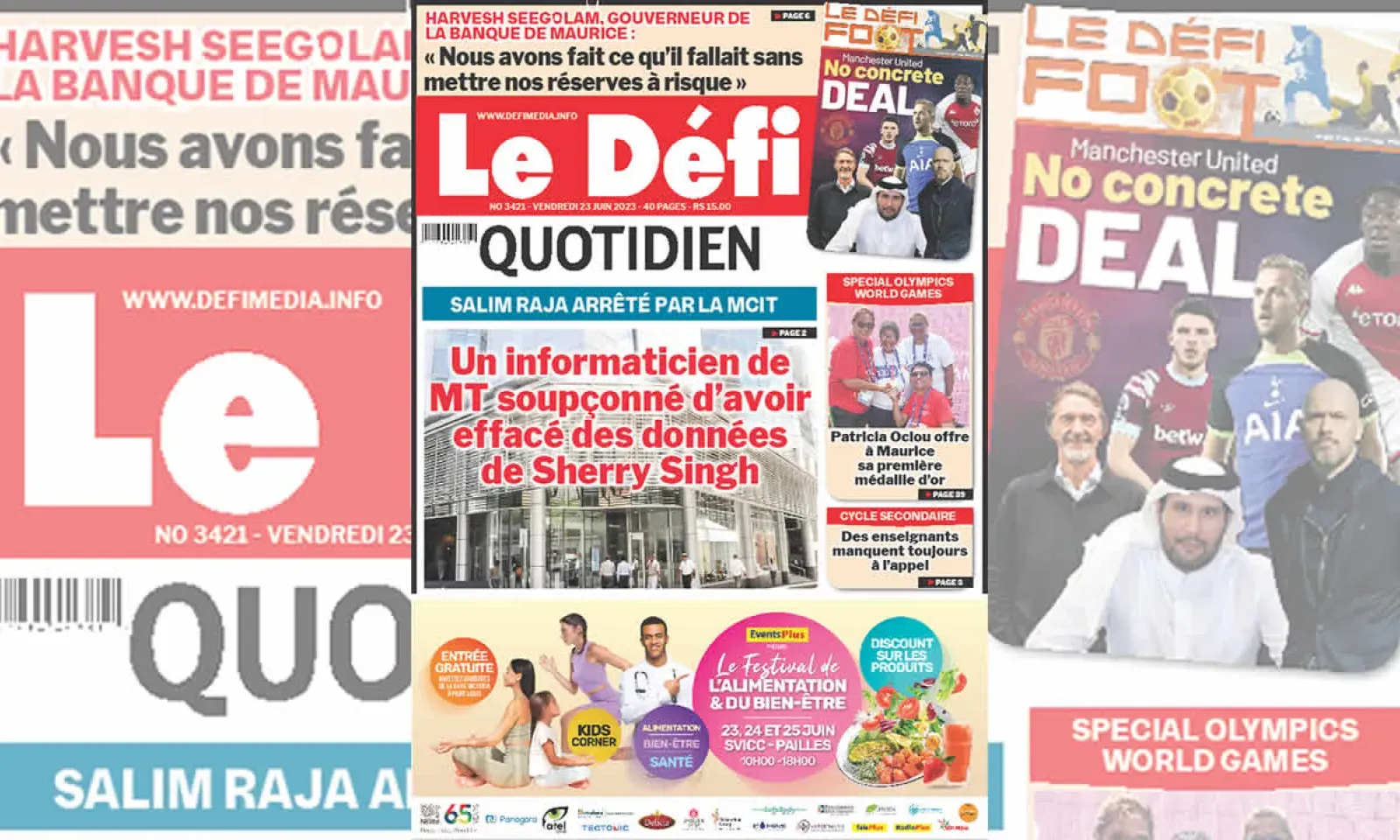 ? Voici la Une du Défi Quotidien. Le journal est en vente à Rs 15 l'exemplaire aux endroits habituels (supermarchés, boutiques, tabagies, superettes). Bonne lecture !