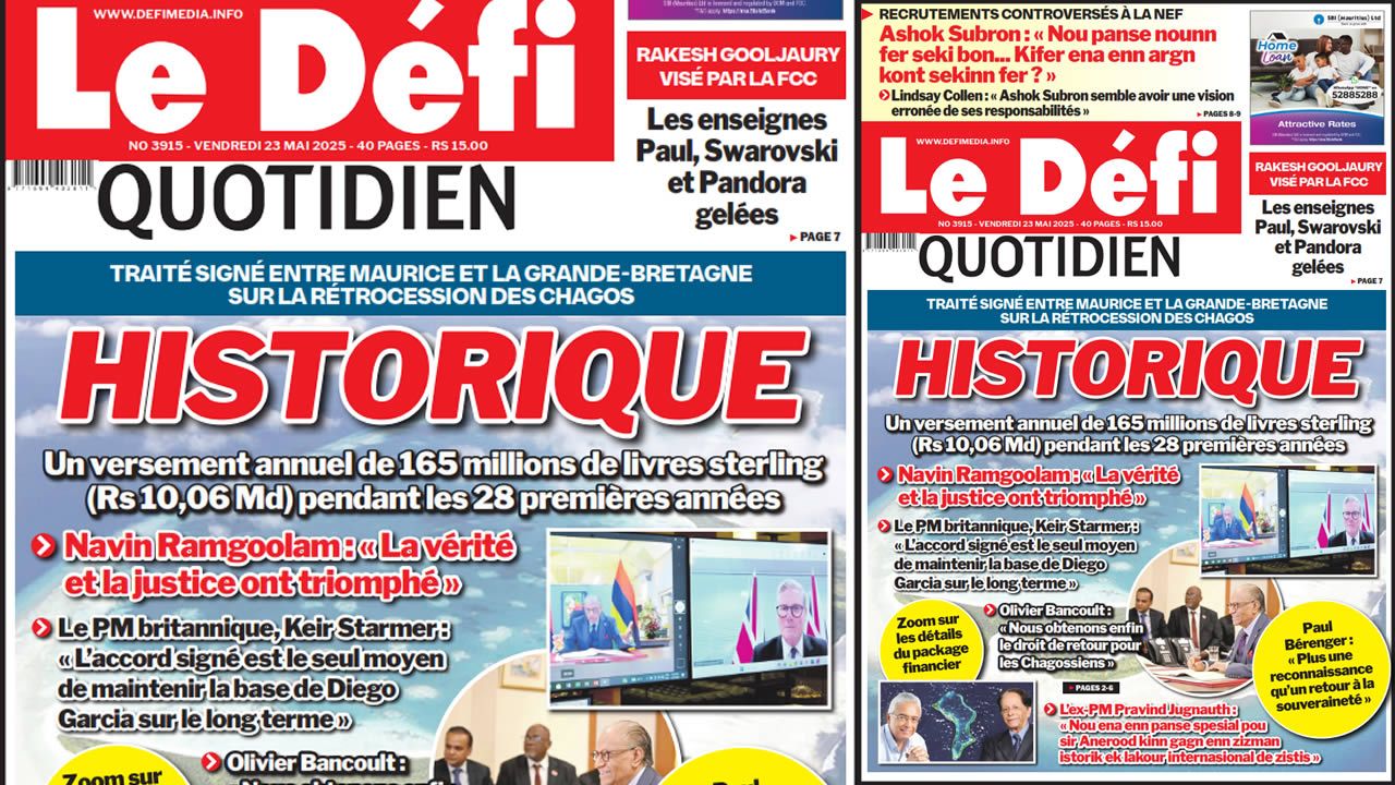Voici la une du Défi Quotidien de ce Vendredi 23 Mai 2025