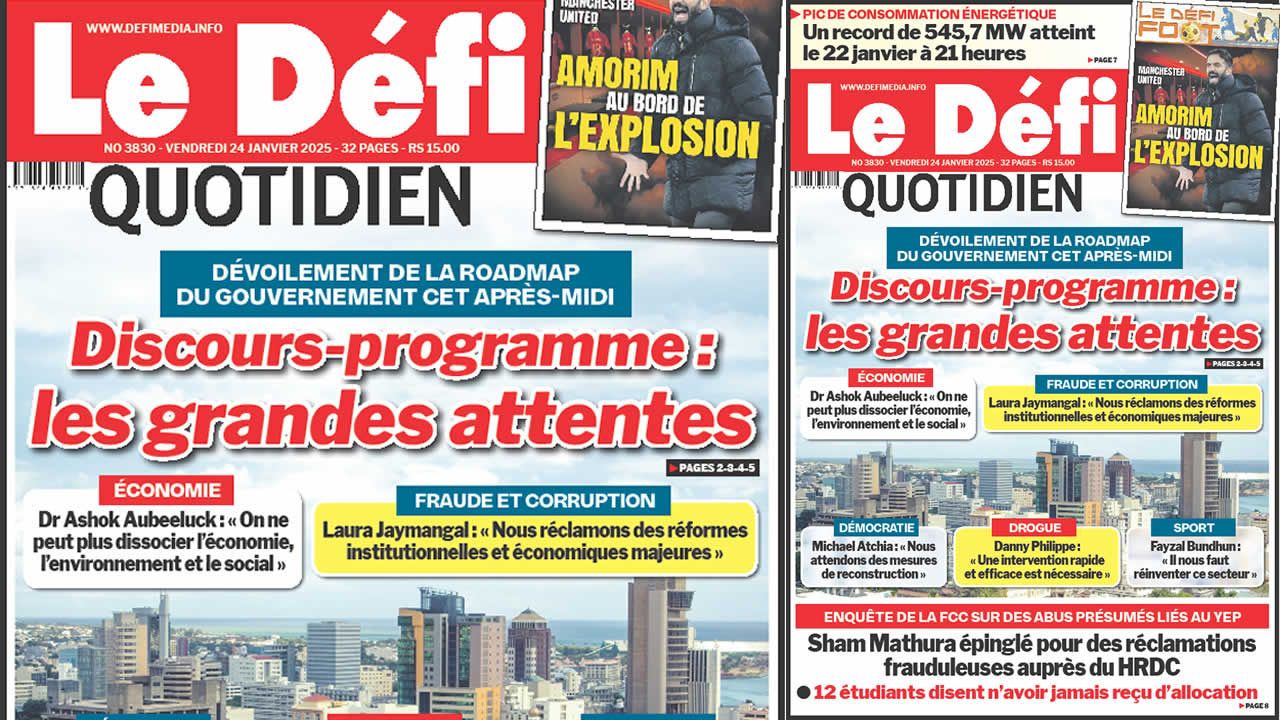 ? Voici la Une du Défi Quotidien. Le journal est en vente à Rs 15 l'exemplaire aux endroits habituels (supermarchés, boutiques, tabagies, superettes). Bonne lecture !