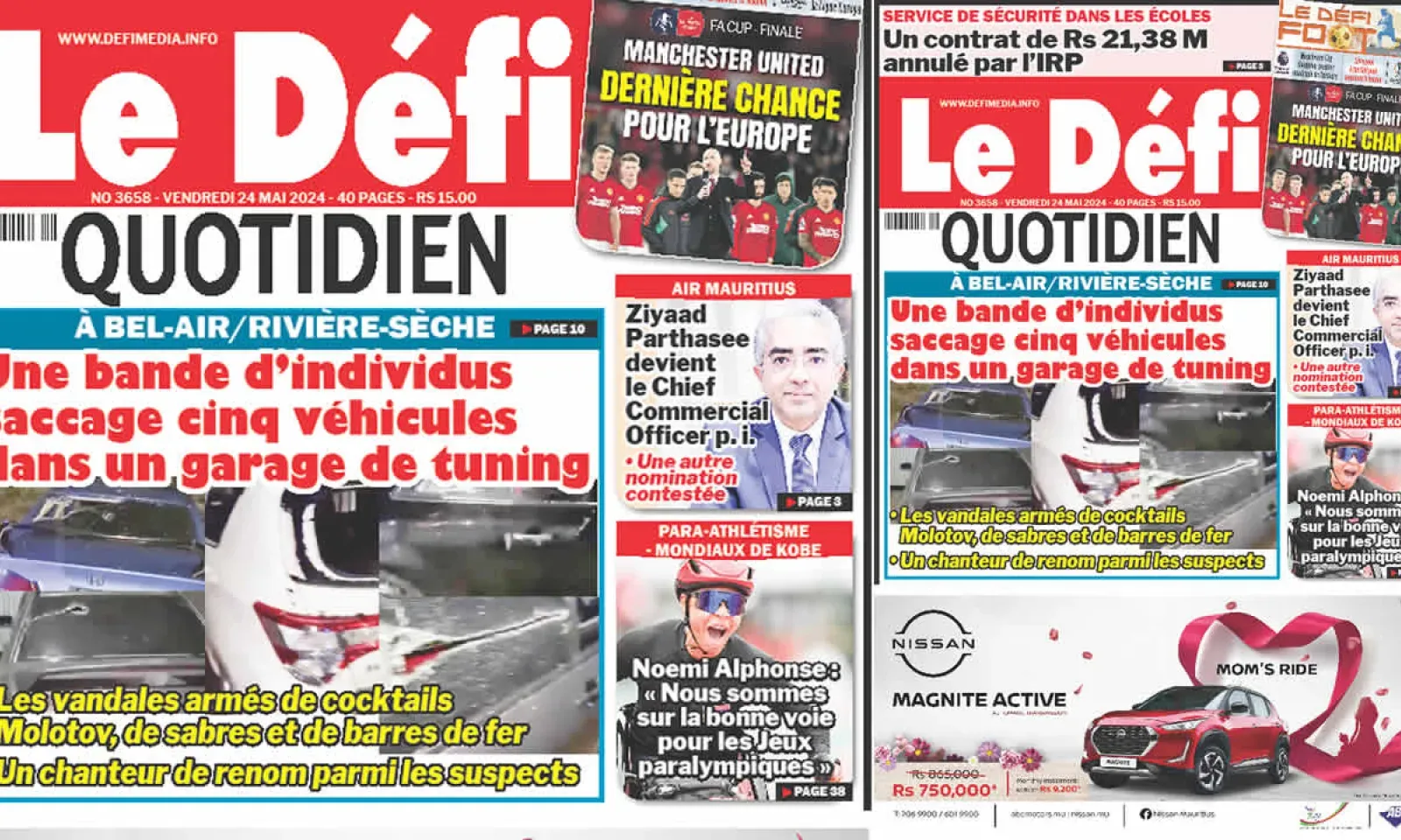 ? Voici la Une du Défi Quotidien. Le journal est en vente à Rs 15 l'exemplaire aux endroits habituels (supermarchés, boutiques, tabagies, superettes). Bonne lecture !
