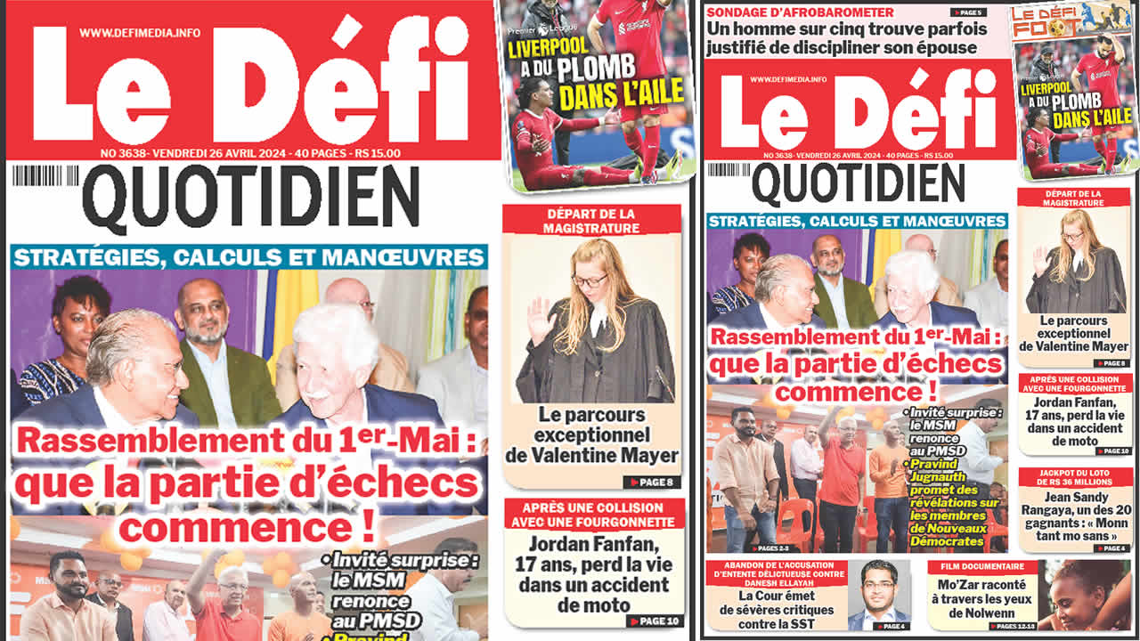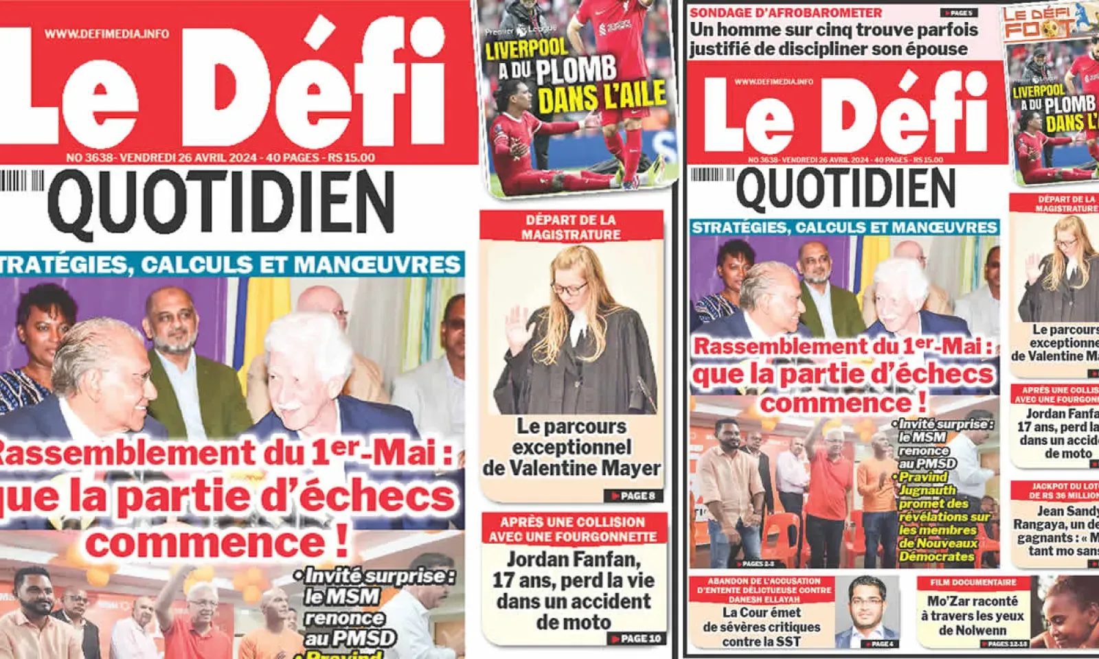 ? Voici la Une du Défi Quotidien. Le journal est en vente à Rs 15 l'exemplaire aux endroits habituels (supermarchés, boutiques, tabagies, superettes). Bonne lecture !