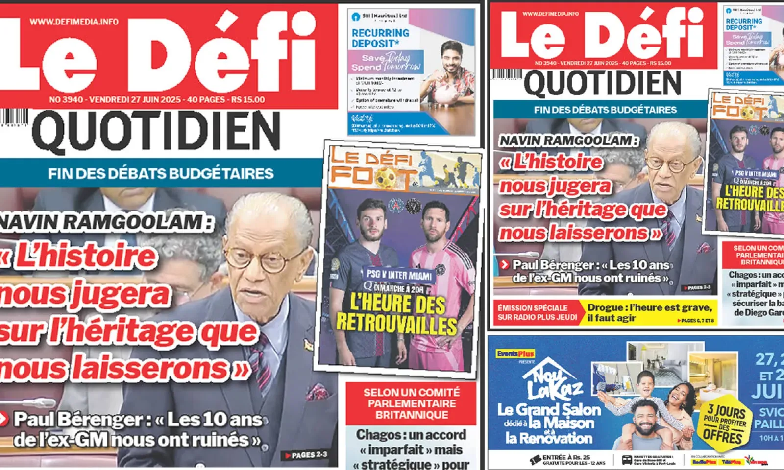 ? Voici la Une du Défi Quotidien. Le journal est en vente à Rs 15 l'exemplaire aux endroits habituels (supermarchés, boutiques, tabagies, superettes). Bonne lecture !