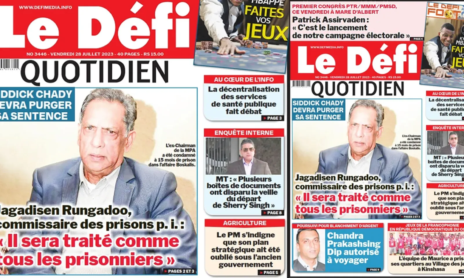 ? Voici la Une du Défi Quotidien. Le journal est en vente à Rs 15 l'exemplaire aux endroits habituels (supermarchés, boutiques, tabagies, superettes). Bonne lecture !