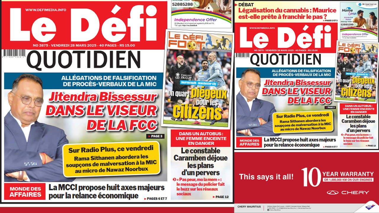 ? Voici la Une du Défi Quotidien. Le journal est en vente à Rs 15 l'exemplaire aux endroits habituels (supermarchés, boutiques, tabagies, superettes). Bonne lecture !
