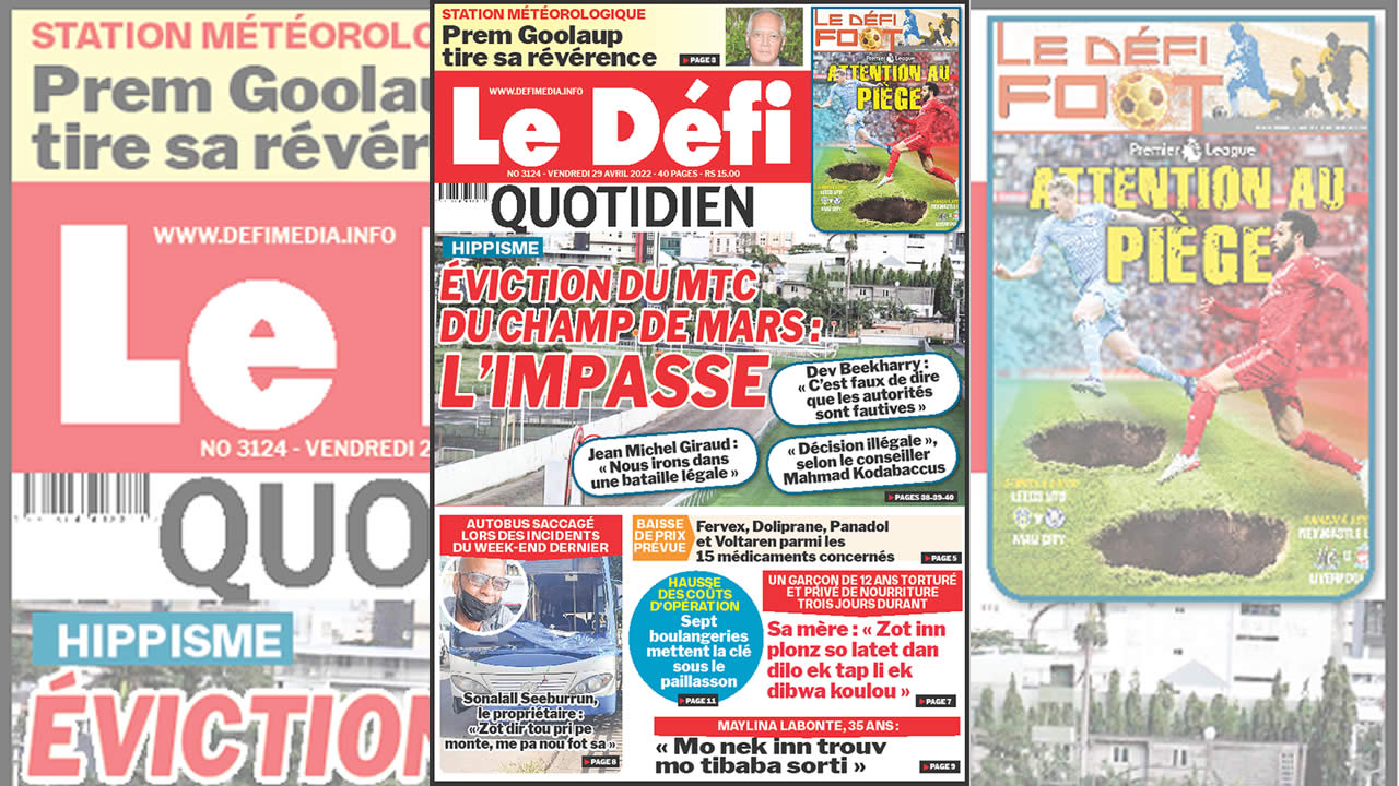 ? Voici la Une du Défi Quotidien. Le journal est en vente à Rs 15 l'exemplaire aux endroits habituels (supermarchés, boutiques, tabagies, superettes). Bonne lecture !