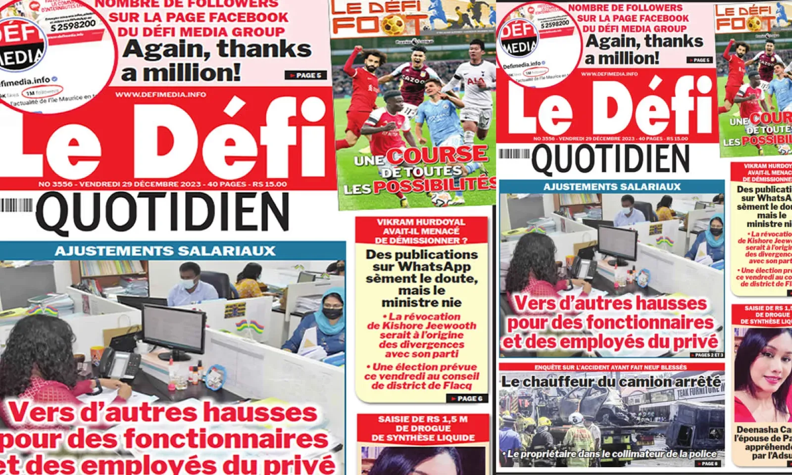 ? Voici la Une du Défi Quotidien. Le journal est en vente à Rs 15 l'exemplaire aux endroits habituels (supermarchés, boutiques, tabagies, superettes). Bonne lecture !