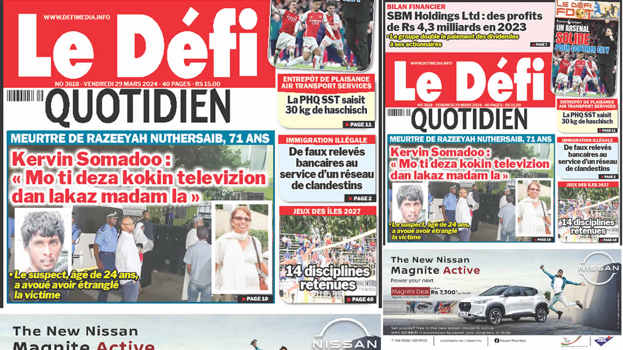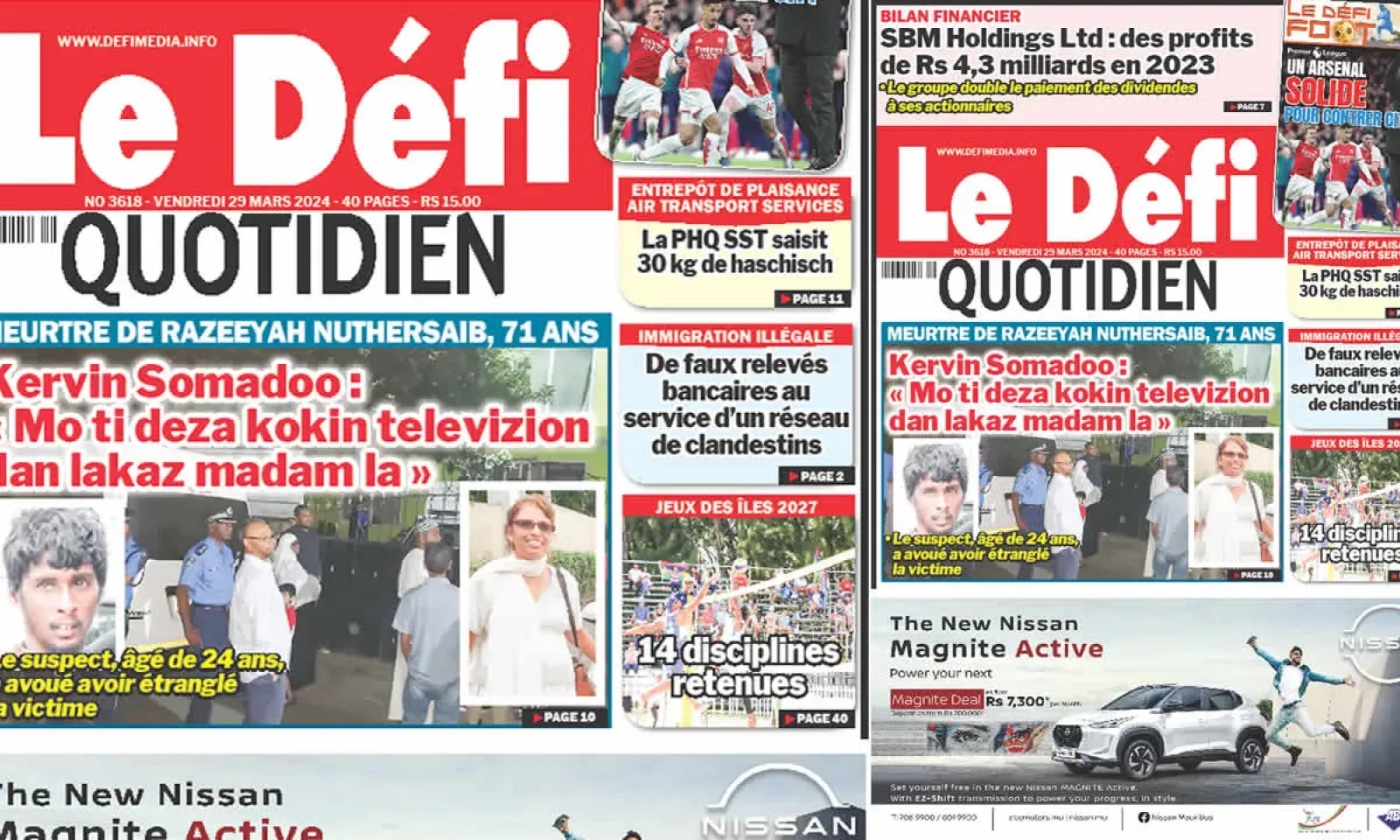 ? Voici la Une du Défi Quotidien. Le journal est en vente à Rs 15 l'exemplaire aux endroits habituels (supermarchés, boutiques, tabagies, superettes). Bonne lecture !