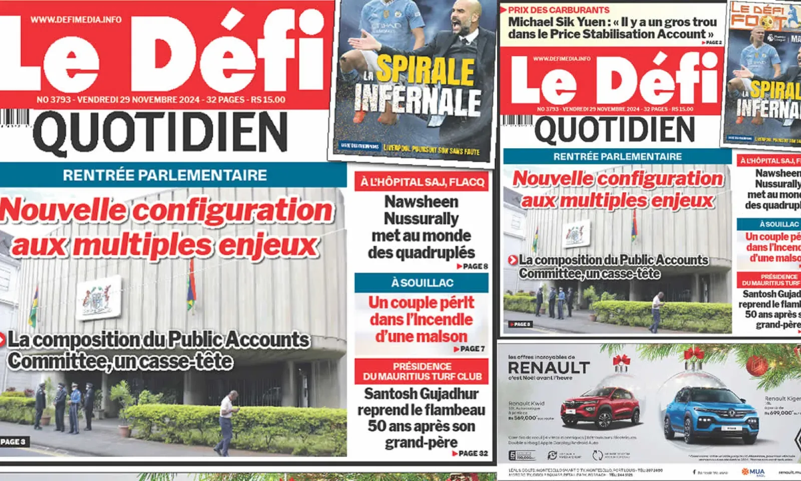 Voici la une du Défi Quotidien de ce Vendredi 29 Novembre 2024