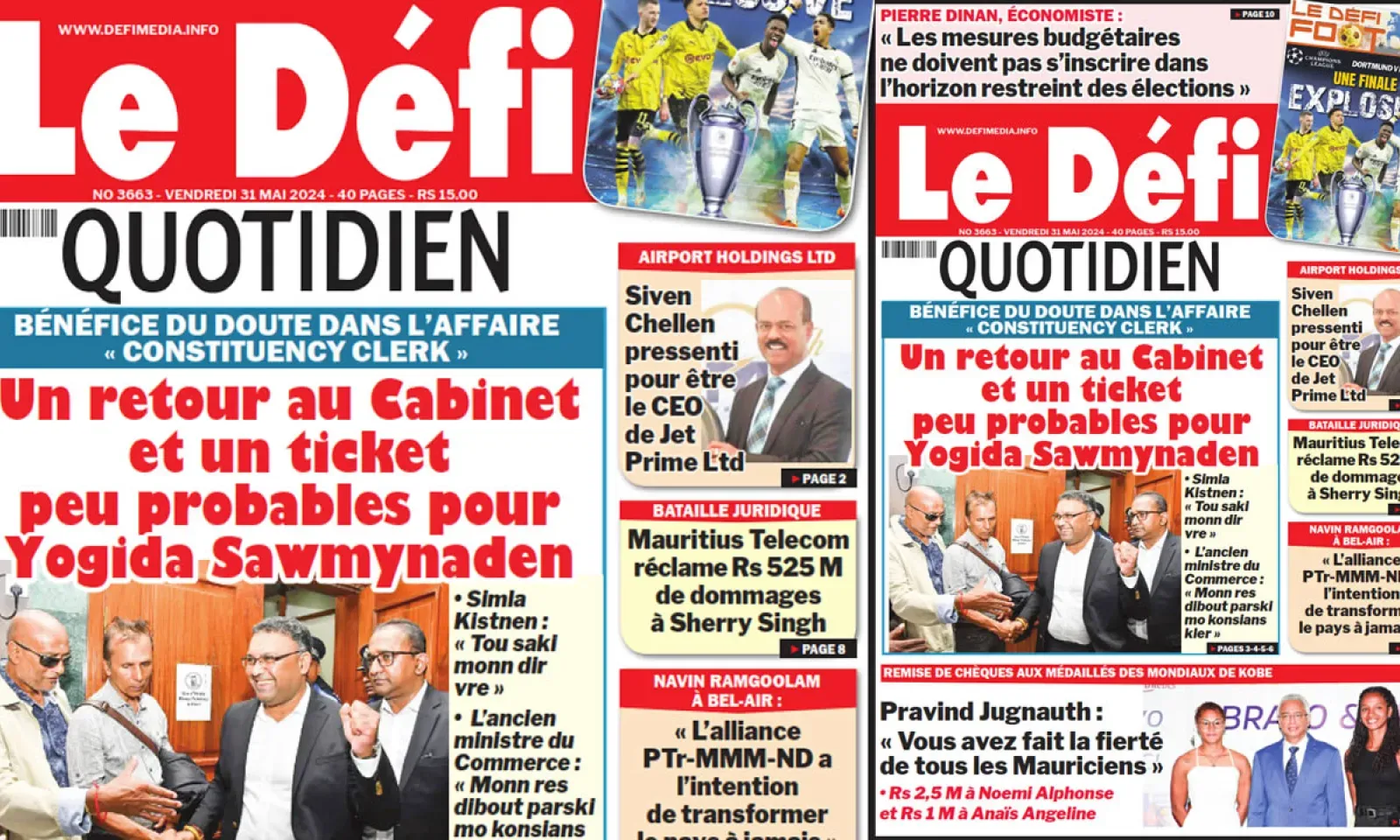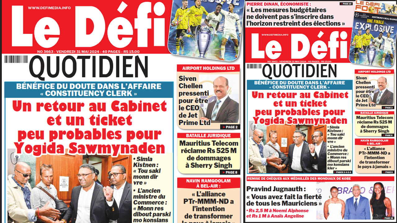 ? Voici la Une du Défi Quotidien. Le journal est en vente à Rs 15 l'exemplaire aux endroits habituels (supermarchés, boutiques, tabagies, superettes). Bonne lecture !
